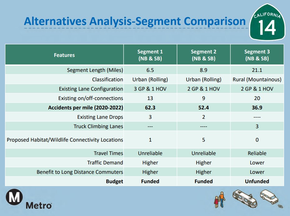 The Metro project page maps the project, but has very little information (no project documents). There are a few Metro SR-14 presentations in agenda documents for the North L.A. County Transportation Coalition. NCTC is the governmental Joint Powers Authority that steers Metro projects in that part of the county (similar to how various Councils of Governments – COGs – do in other subregions.)
