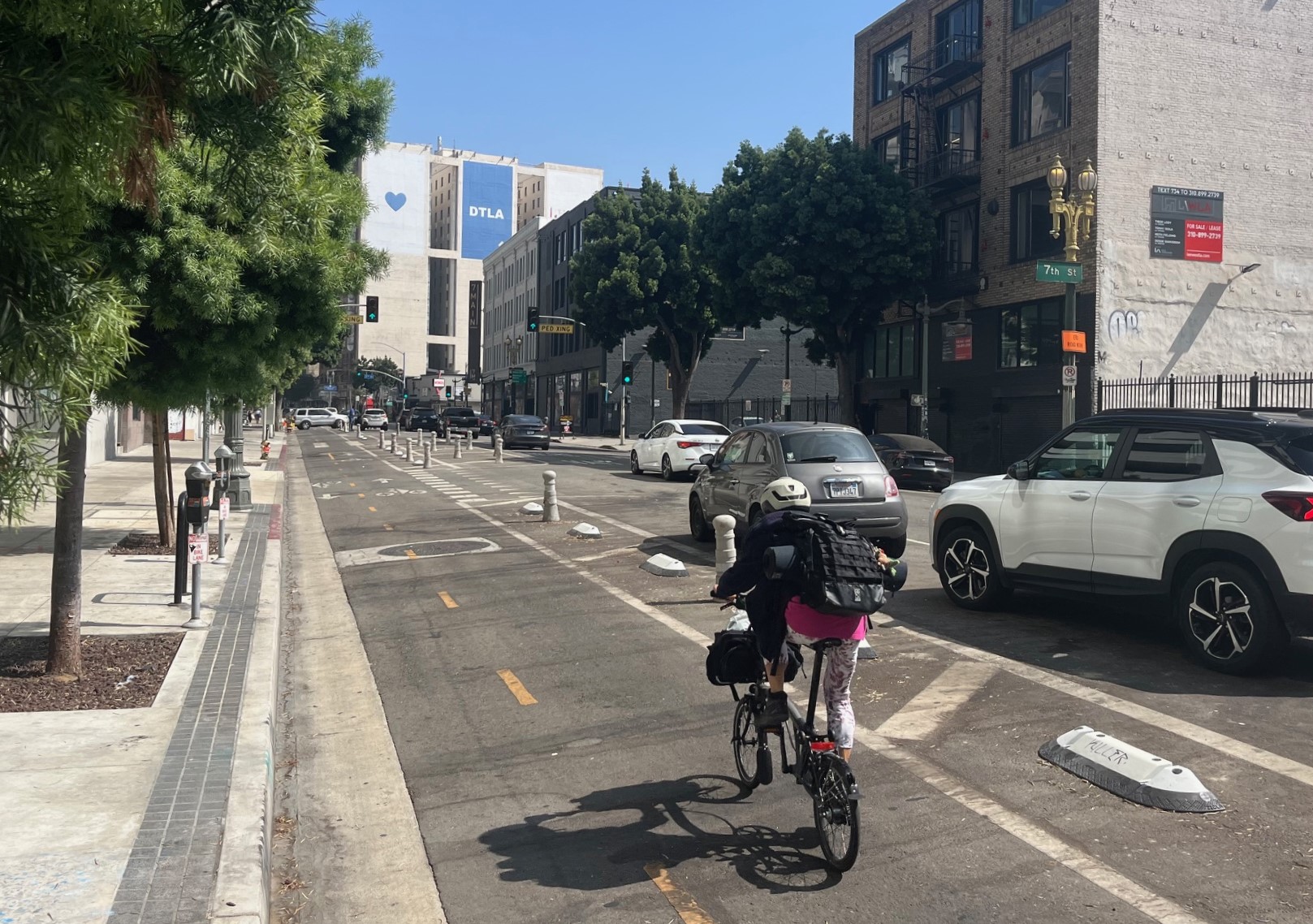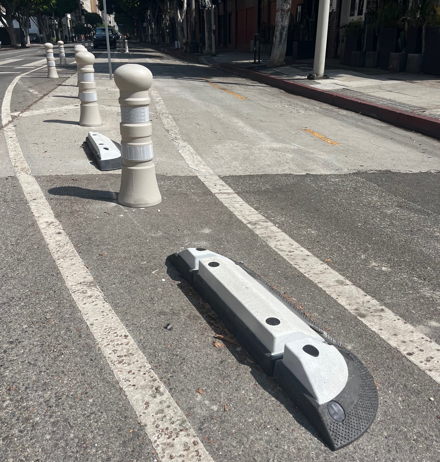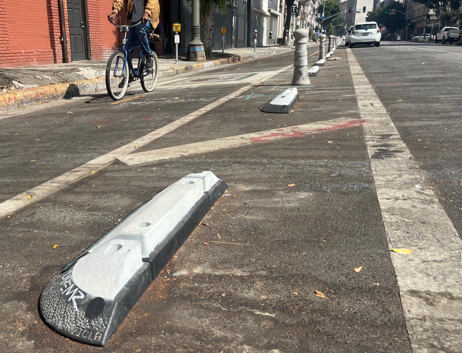 The L.A. City Transportation Department (LADOT) recently installed new plastic curb features (see photos below) along four blocks of the two-way parking-protected bikeway on Main Street in downtown Los Angeles. These function somewhat like wheel stop features installed in Angelino Heights, but are a slightly different rigid plastic modular curb, bolted into the street.