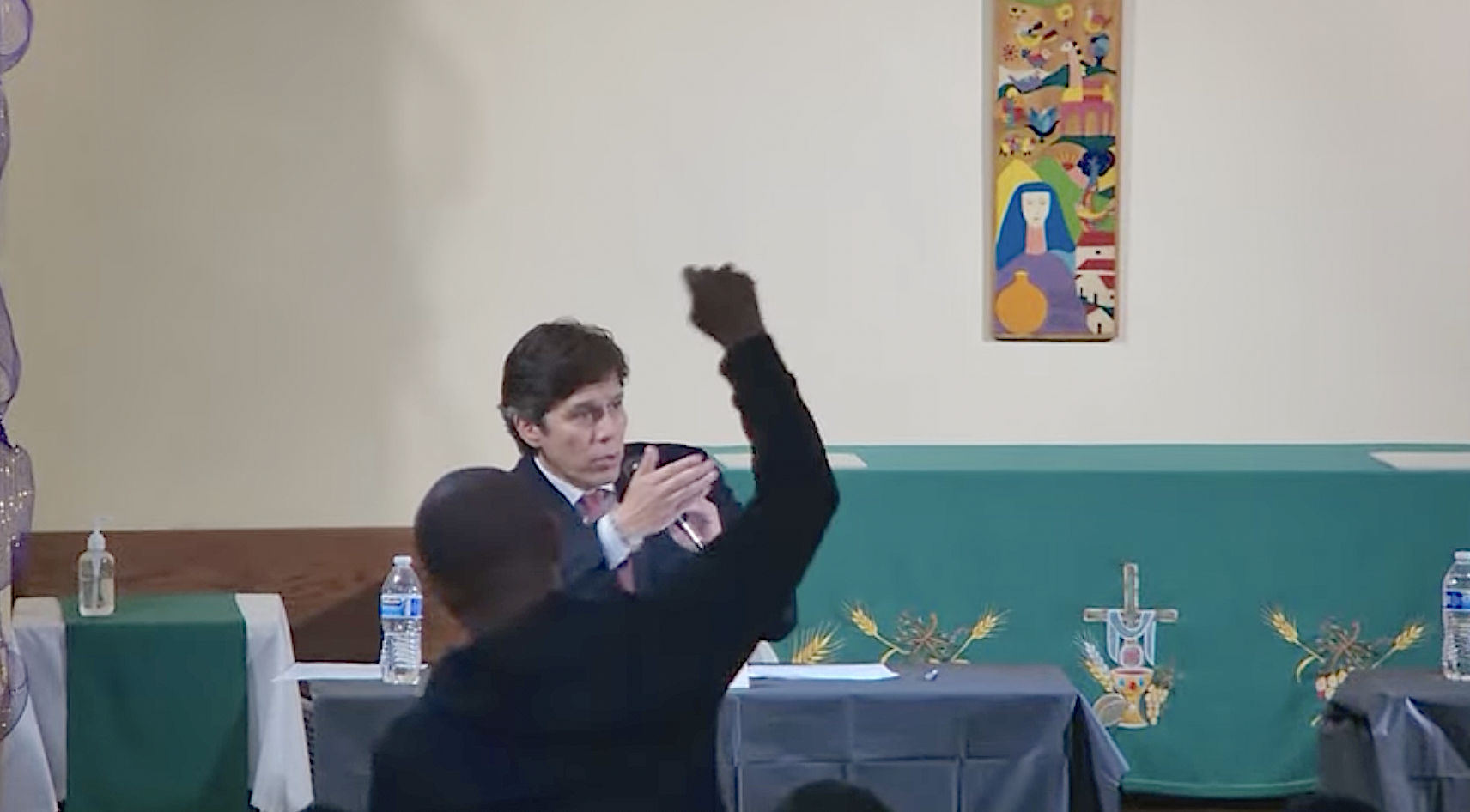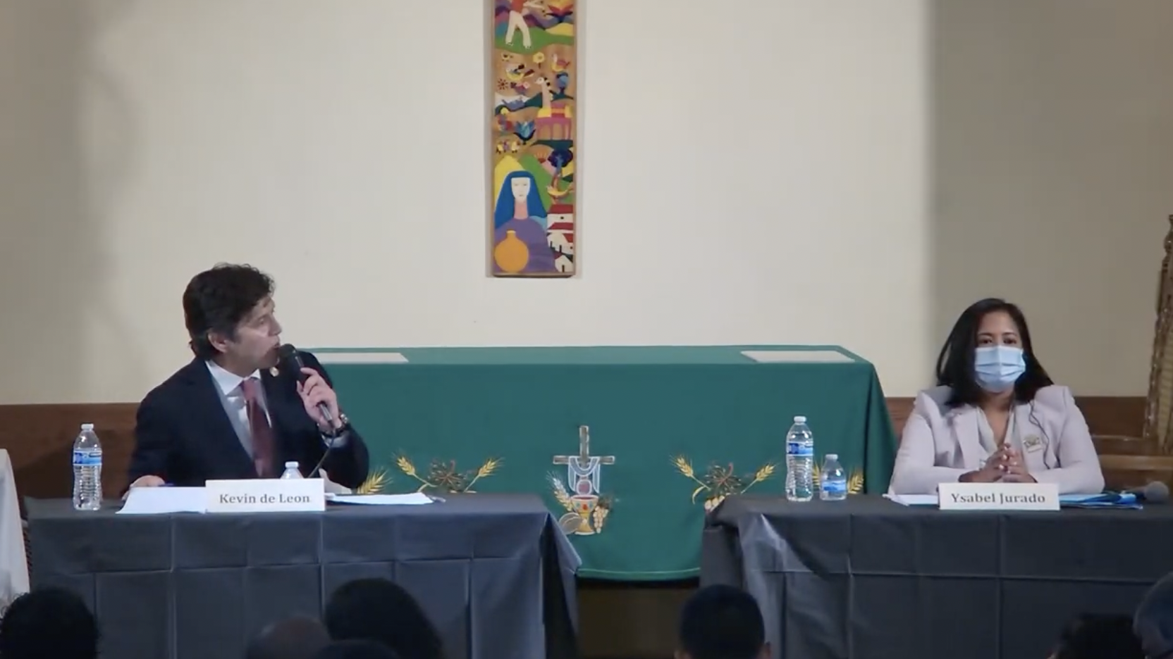 “I’ve made mistakes, without a doubt,” disgraced CD14 councilmember Kevin de León said in Spanish as he concluded his combative introductory remarks at last Wednesday night’s bilingual candidate debate hosted by Boyle Heights Beat and Proyecto Pastoral at Dolores Mission Catholic Church in Boyle Heights. “But – and I want to underscore this – I don’t lie. I don’t lie. And my opponent has lied a lot.”