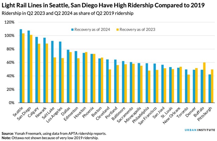 Light rail ridership recovery has been stronger than heavy rail. For September Metro notes that ridership is up significantly on all of its light rail lines (year-over-year comparing September 2024 to 2023):