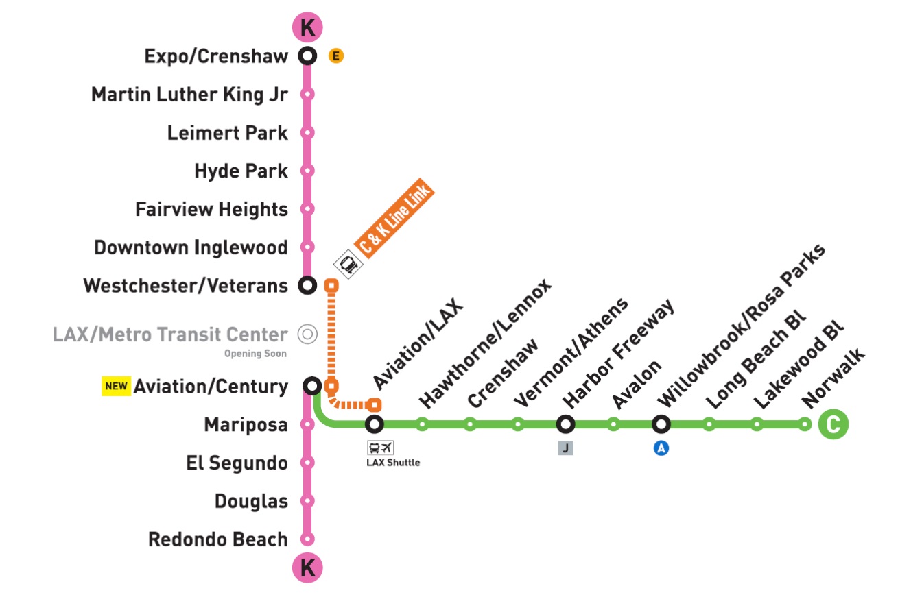 As of Sunday, the C Line terminus will no longer be Redondo Beach. The western terminus of the C Line will be Aviation/Century, where riders can transfer to the K Line.
