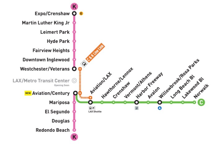 The big change is that the four South Bay Stations at the west end of the C (former Green) Line will become the south end of the K Line. Though for a couple months, the upper K Line will connect to the lower K Line via a bus bridge between Westchester/Veterans and Aviation/Century stations.