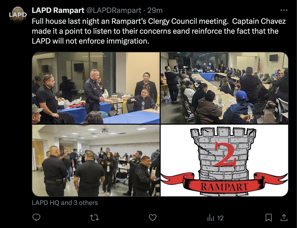 First proposed by then-Chief Daryl Gates in 1979, it was intended to encourage undocumented immigrants to report crime without fear of deportation. But, as advocates documented at the time, training and enforcement around the policy had been lax and uneven. Then, when the Border Patrol was invited to assist LAPD with keeping the peace during the 1992 uprising, both agencies seized the opportunity to round up around a thousand so-called “riot aliens,” regardless of whether they were engaged in criminal activity.