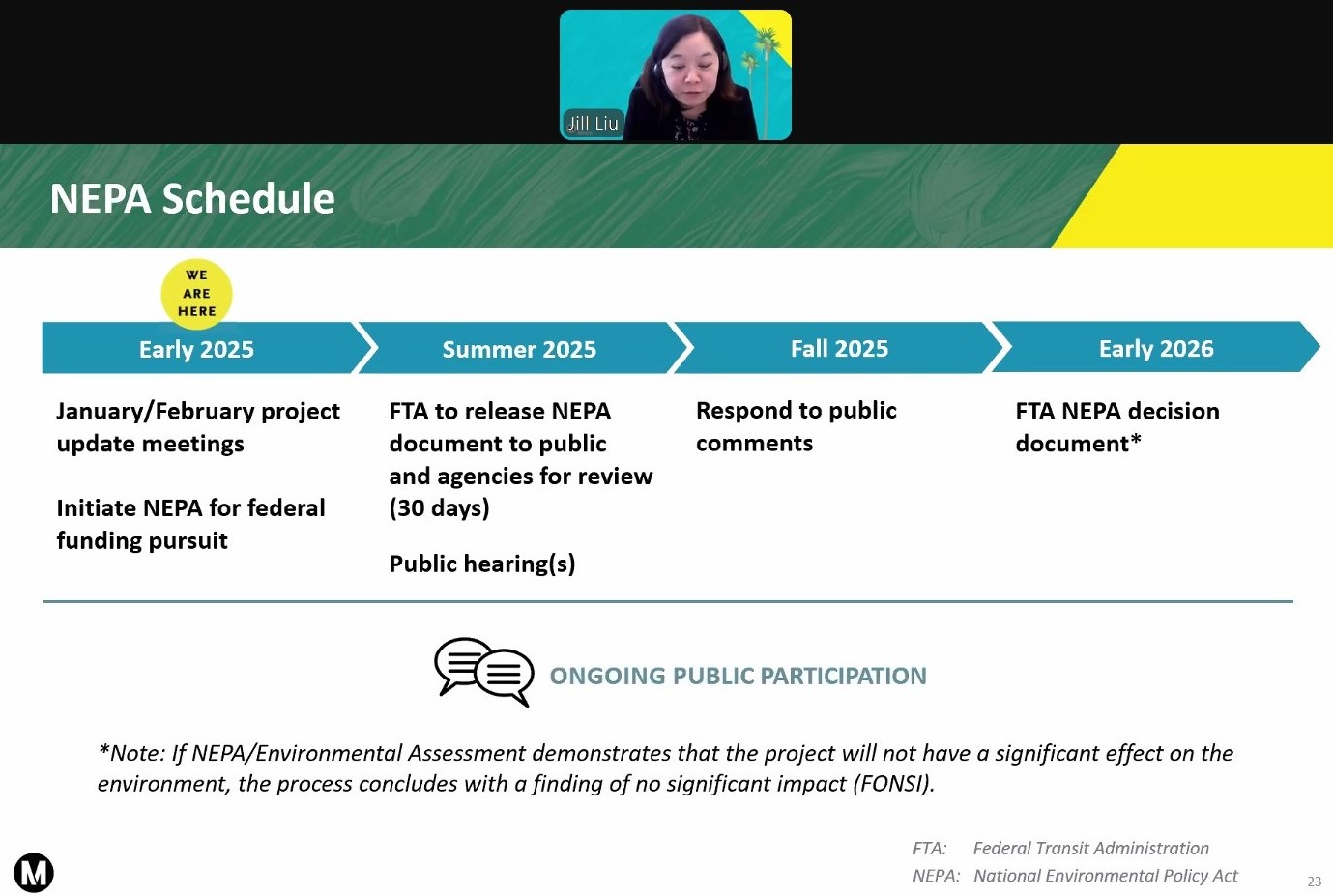 Early on, Metro had intended to fund the project using local and state funding, so the initial environmental approvals were done under state law (CEQA – the California Environmental Quality Act). When the cost of the initial 5-mile phase came in at roughly $8 billion, Metro decided to also seek federal funding. Under federal law (NEPA – the National Environmental Protection Act), the project needs additional environmental clearance for federal funds.