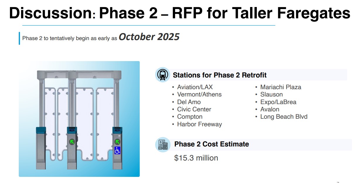 - This week the Metro board is expected to approve $15.3 million for phase 2 of installing taller and more robust station faregates (staff report) purported to benefit station security. Metro already announced it is installing hardened faregates at a half-dozen new stations opening this year, and at ten existing stations.