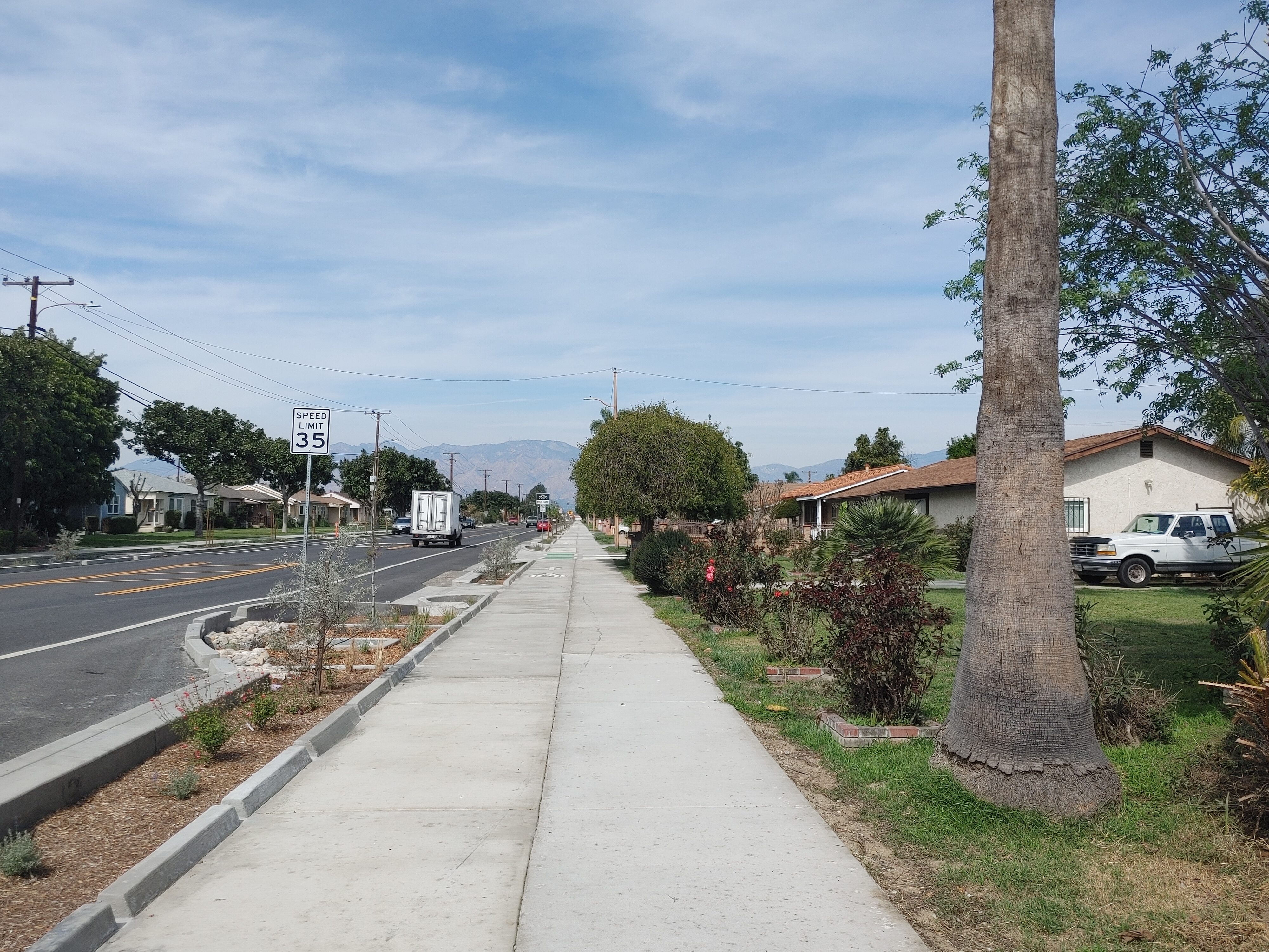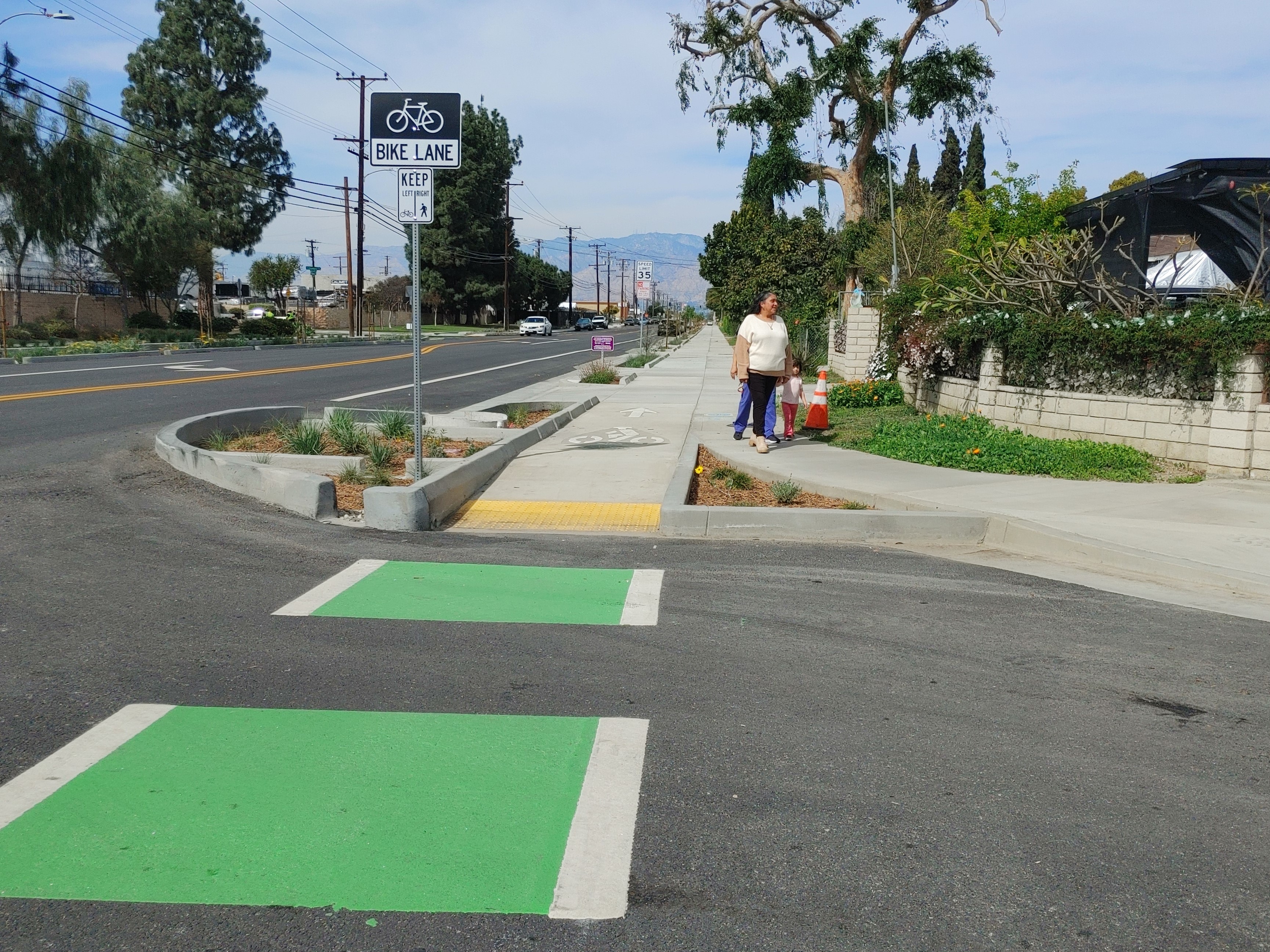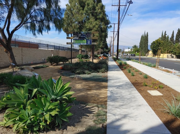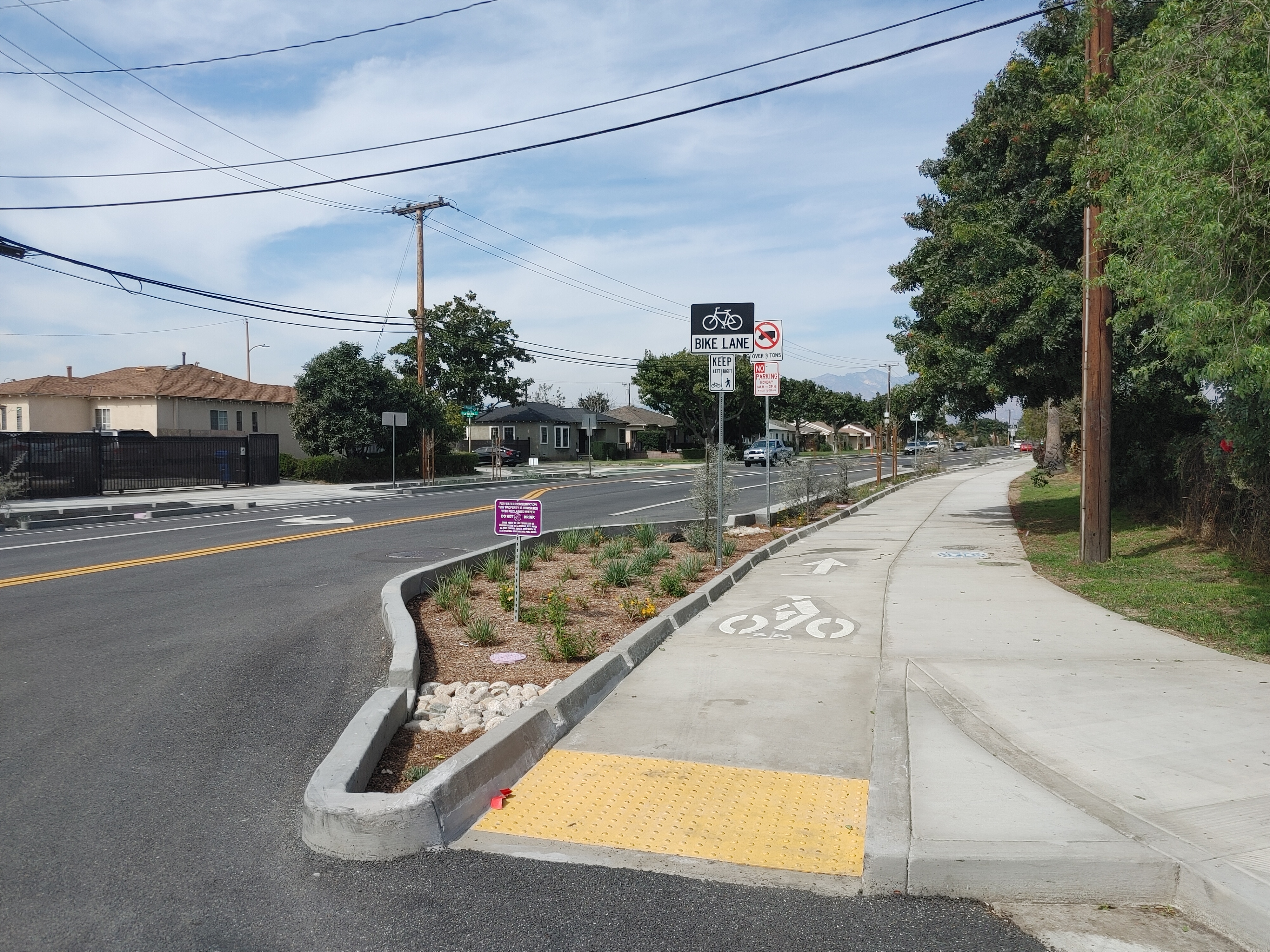 The protected walkway/bikeway is at sidewalk level, creating a wide path for users. While sidewalk-level bikeways are not unusual in bike-friendly places (for example the Netherlands) the design is a first for the San Gabriel Valley. Merced is the longest stretch of sidewalk-level protected bikeway in L.A. County (it appears to be the third such bikeway in the county – after short sidewalk-level portions of Santa Monica’s 17th Street and Pomona’s Valley Boulevard – though neither of those facilities includes Merced’s rain features.)
