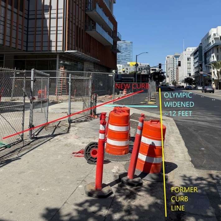 Olympic + Hill widened Olympic Boulevard by about 12 feet. This block of Olympic had a 60 foot roadway; now it’s about 72 feet wide.