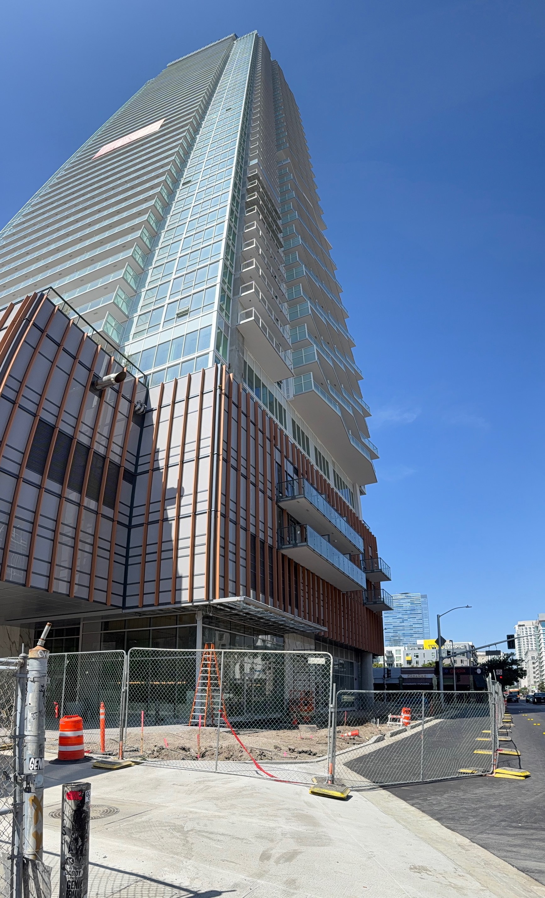 Construction is winding down for Olympic + Hill, a 54-story 685-apartment residential tower at the corner of, you guessed it, Olympic Boulevard and Hill Street in downtown Los Angeles. 2024 coverage at Urbanize notes that at approximately 593 feet tall, the building will rank among the city’s tallest residential buildings.