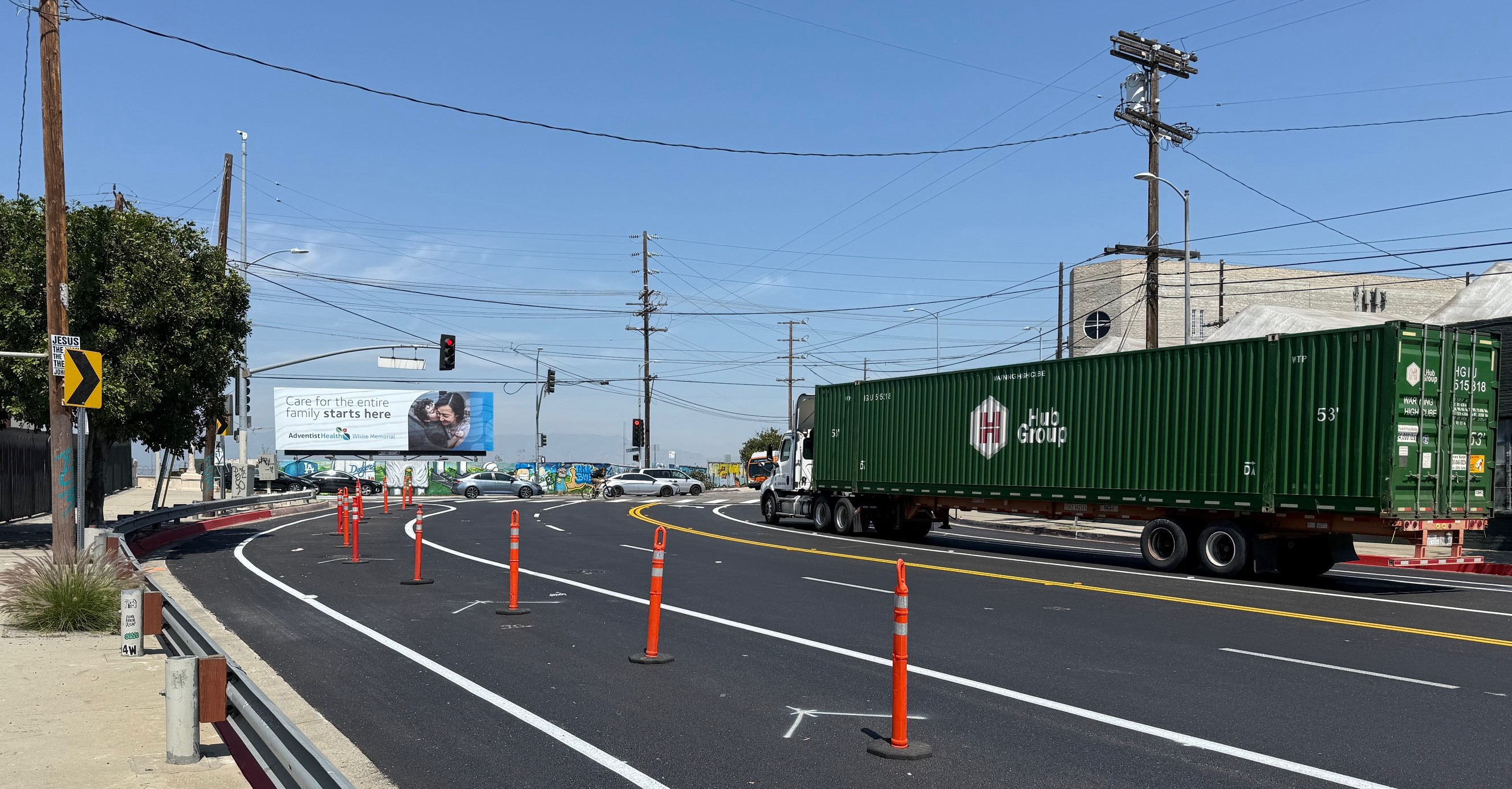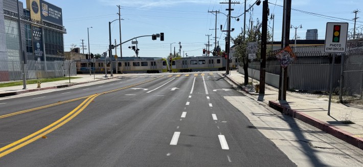 And in Boyle Heights, just a couple blocks east of Union Station, the city is currently installing just under half a mile of new bike lanes on Mission Road, between First Street and Cesar Chavez Avenue. Earlier this week, the striping appeared complete but bike symbols and some plastic bollard protection were pending.