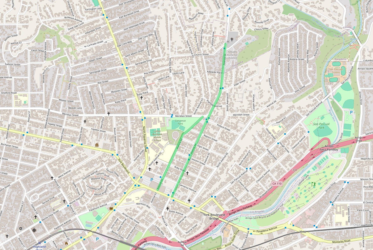 - Two-way bike lanes on Avenue 64 from Meridian Street to Church Street – 0.35 miles. For what it’s worth, about 80 feet of the east [northbound] bike lane at Church Street is in the city of Pasadena.