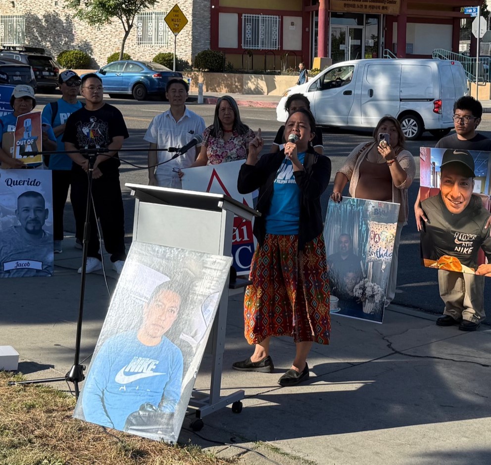 Two speakers related their distressing experiences of family members kidnapped by ICE during the Ambiance Apparel workplace sweep in the downtown Fashion District on June 6, the first day of ICE’s intensified actions across Southern California. At Ambiance, ICE kidnapped 45 workers, among them 15 members of Koreatown’s Zapotec community. The brother of a victim spoke of inhumane conditions, including how abductees were moved around, sleeping in vans with no access to restrooms or showers. A detainee’s daughter spoke of workers being woken up and forced to sign documents they did not understand.