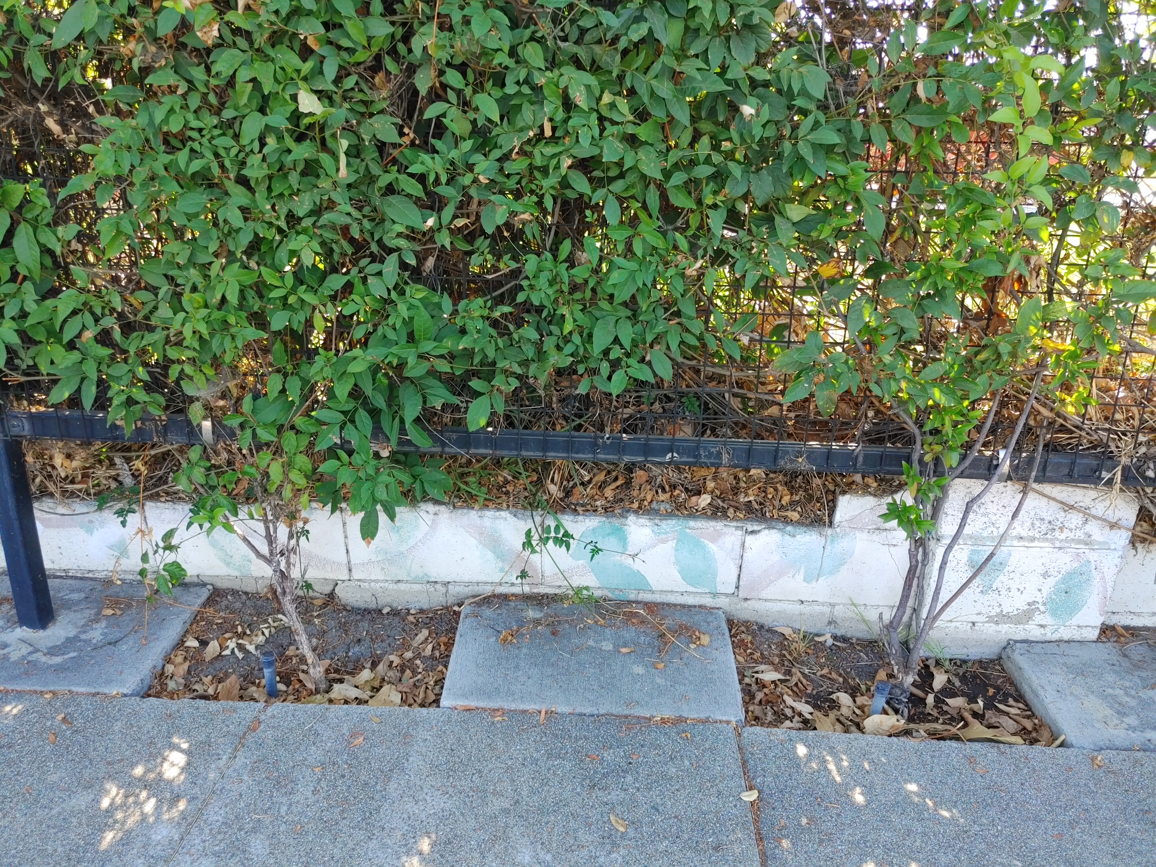 Previously, this passageway was part of a wider beautification program in the La Puente Valley where school kids painted vines on cinderblock walls. More recently, these degraded murals were replaced with real vines, though the remnants still show.