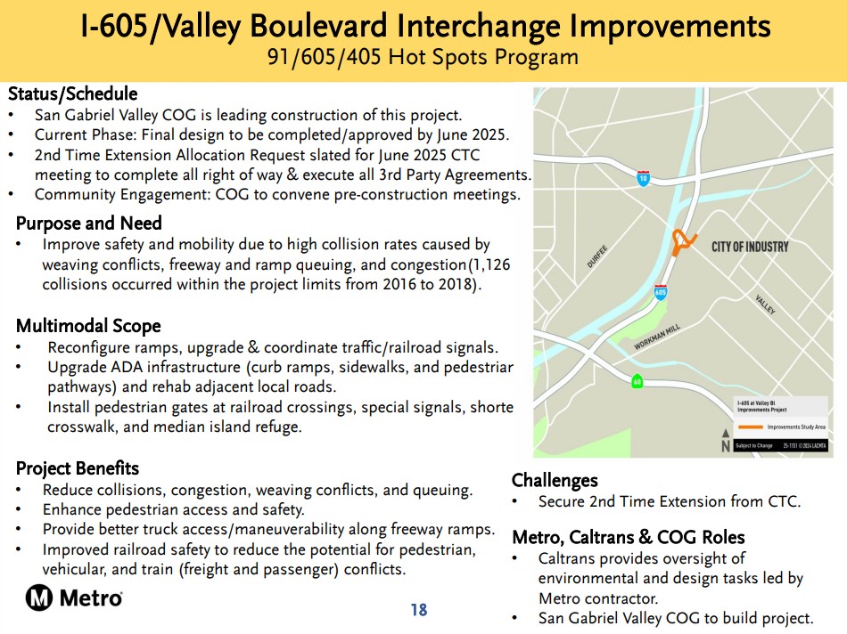 This month there was a bit of news on the ~$50 million Metro/Caltrans 605 Hot Spot project at Valley Boulevard: construction will be managed by the SGVCOG. The arrangement is similar to the 57/60 project above.
