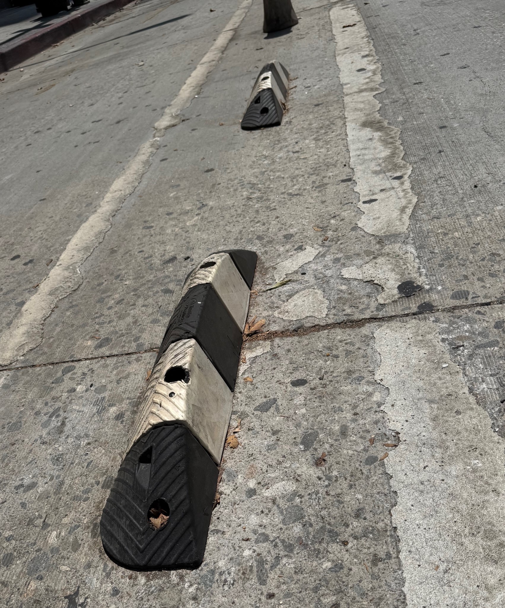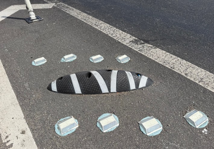 Recently the city went further and installed bolted-down hard-plastic “delineators” in the buffer area. These are sometimes called armadillos, though that is apparently a proprietary name. They are basically the same hard-plastic stop used along the Elenda Street protected bikeway in Culver City.