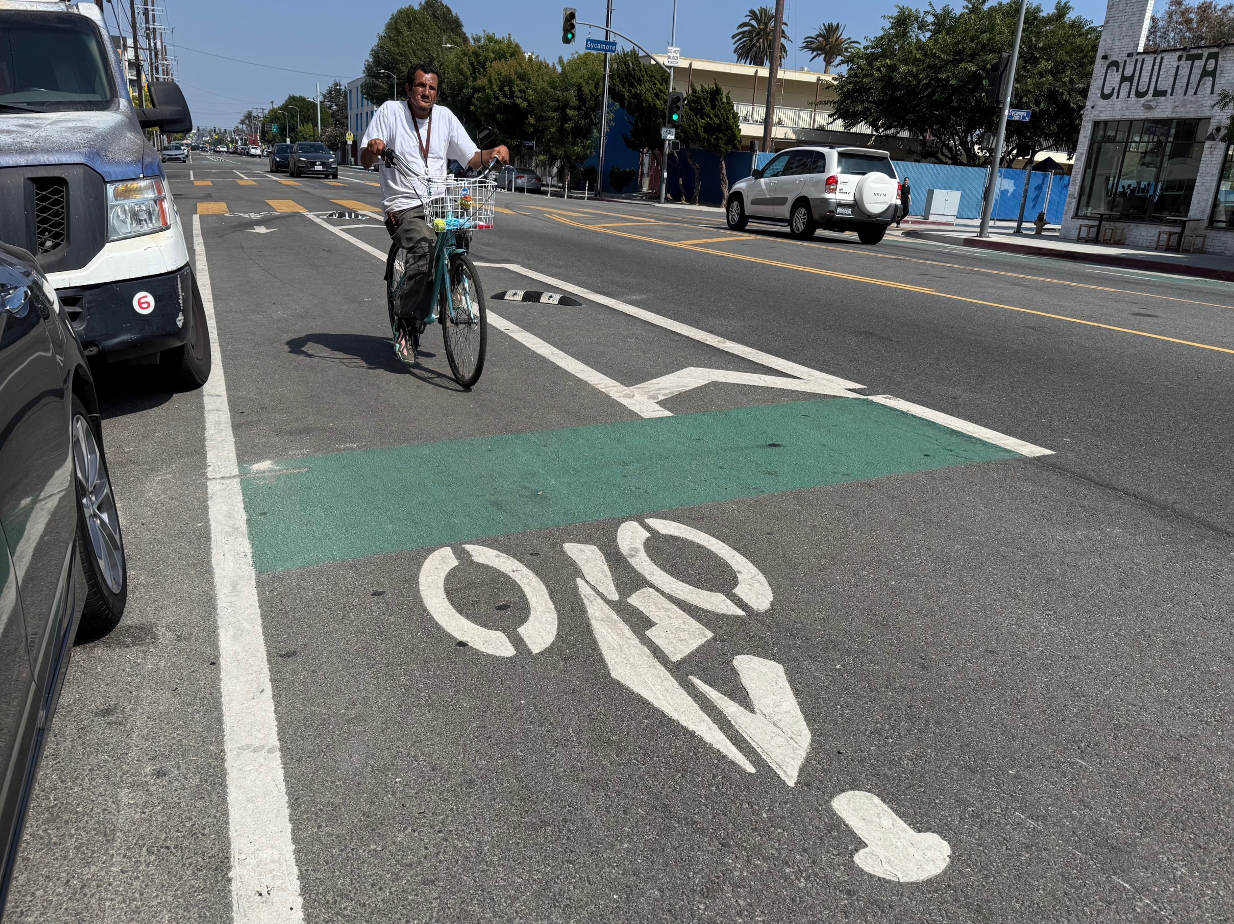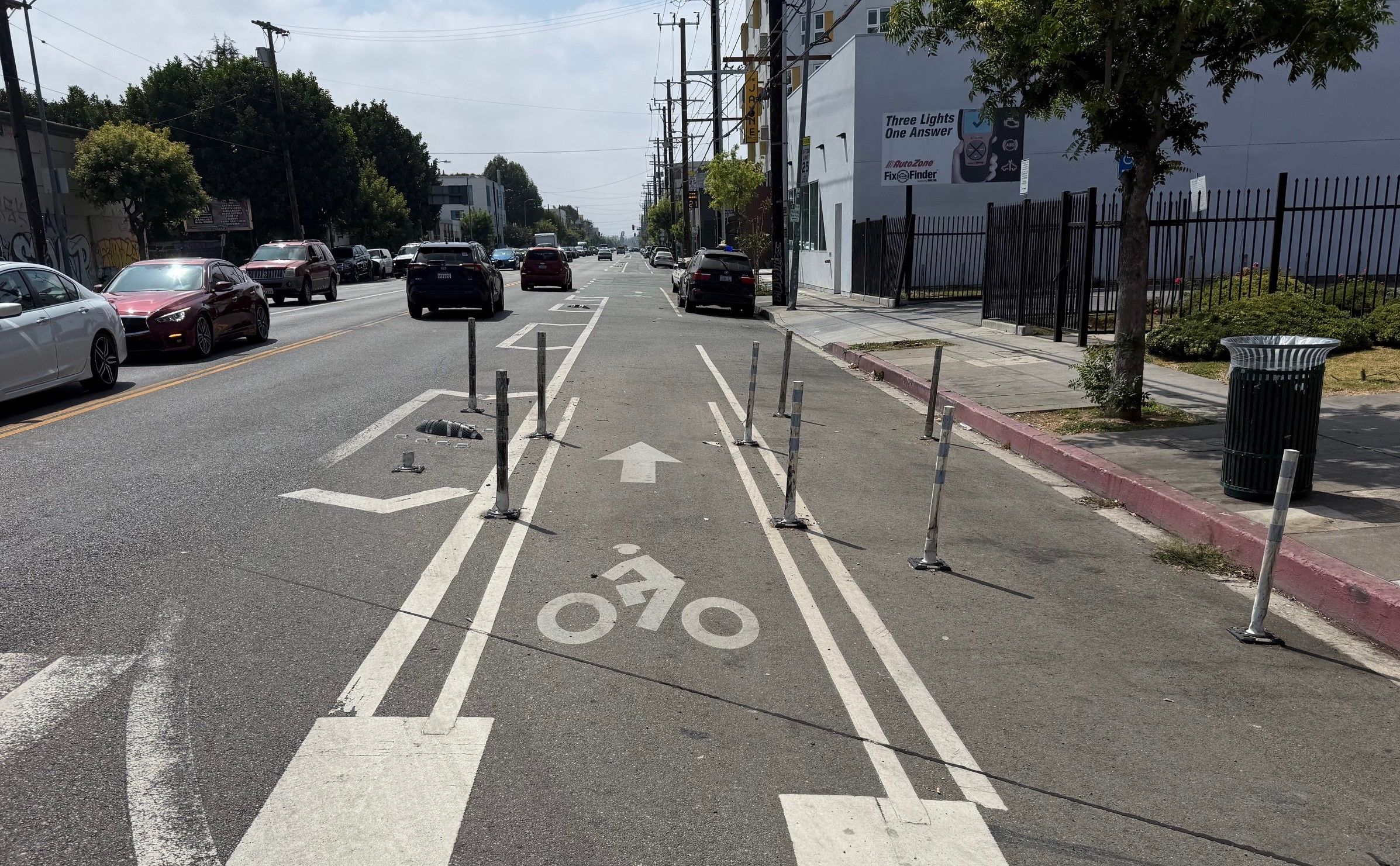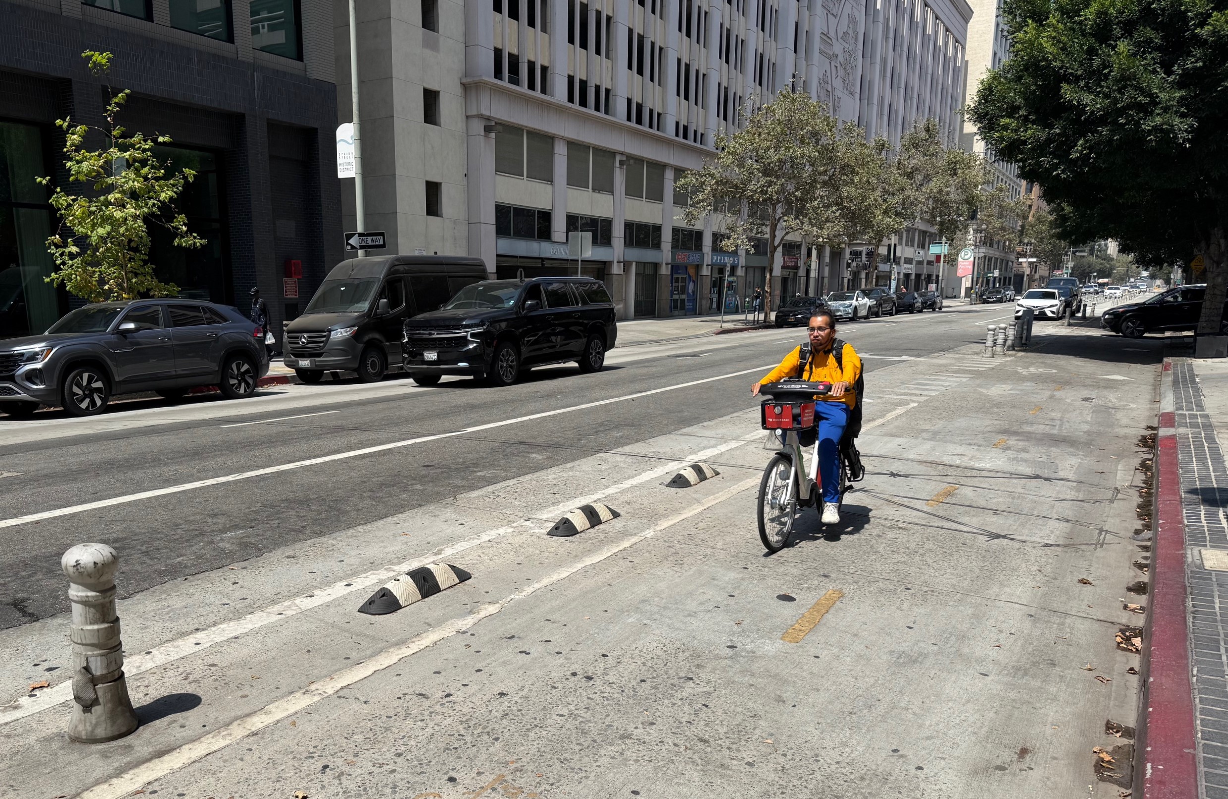 The result is an improvement; fewer drivers appear to be using the bike lane. For L.A., it is a unique hybrid type of bike facility. The bike lane is not quite protected; drivers still cross it to get to and from curb parking spaces. But drivers have to slow down a bit to maneuver around – sometimes over – new plastic bumps.