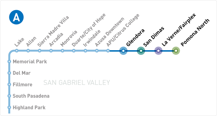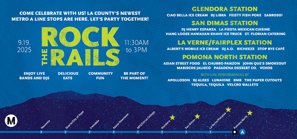 - Friday 9/19 - Metro will open a brand new extension of the A Line, this portion of which was formerly known as the Foothill Gold Line. The world's longest light rail line (today 48.5 miles) adds nine more miles to span 57.6 miles - from Long Beach to Pomona. Metro will open four new stations: Glendora, San Dimas, La Verne/Fairplex, and Pomona North. On Friday from 11:30 a.m. to 3 p.m., Metro will celebrate with Rock the Rails featuring live music, DJs, local food, and more - at all four of the new stations. The next extension opens to the public at 12 noon on Friday. All Metro transit rides are free all weekend: from Friday morning until 3 a.m. until Monday 9/22. See Metro A Line extension opening webpage for event details.