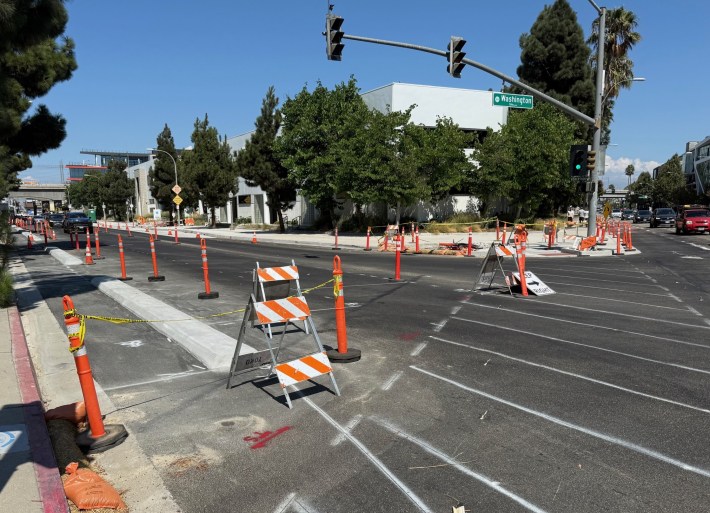 The project reduces a five-lane street down to just three lanes for cars, adding protected bike lanes, new bus bays, and an expanded sidewalk. It also eliminates a dangerous slip lane at Washington Boulevard.