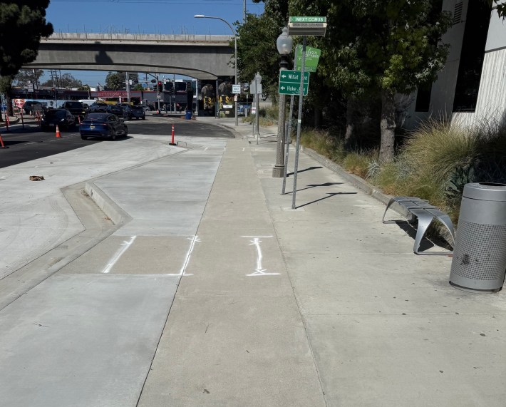 The southbound bike lane is curb-protected, similar to top-quality facilities in Santa Monica, Long Beach, and Pomona.
