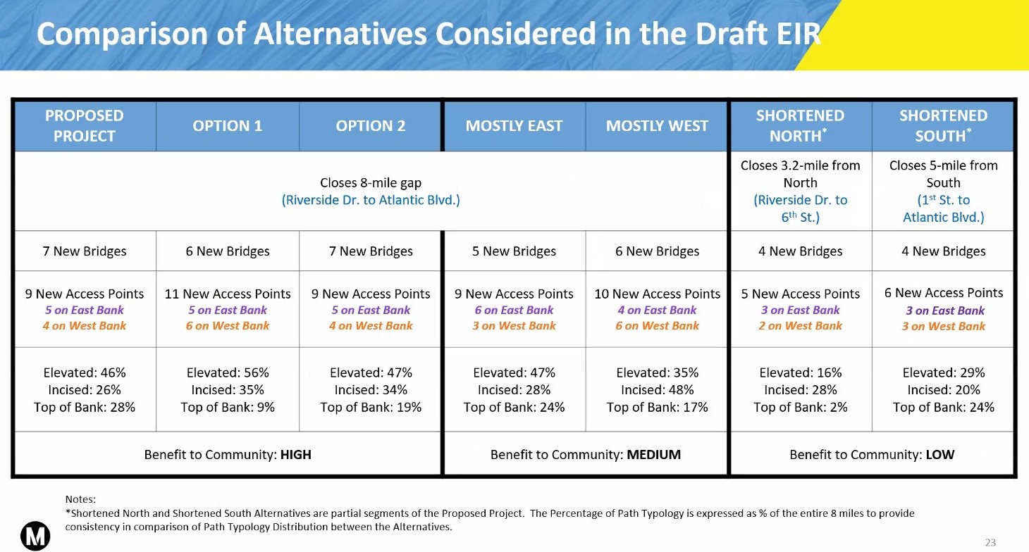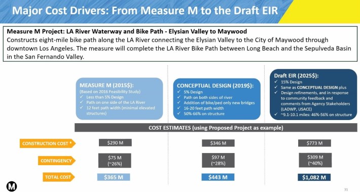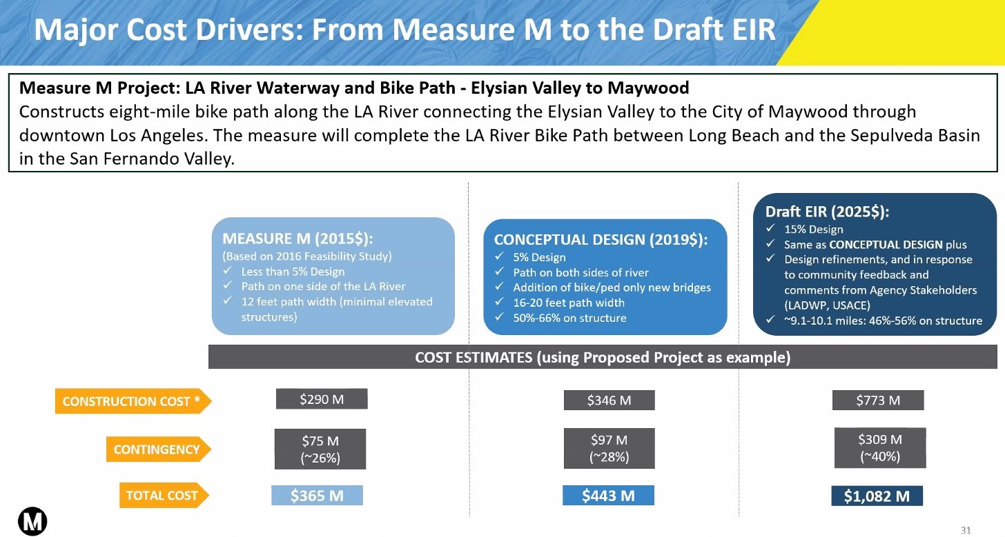 Measure M programmed $365 million for the river path, scheduled for a 2023 groundbreaking and a 2025-27 opening. The project had been on the initial Metro Olympics project list, but was quietly removed when it became clear that construction would not be completed ahead of 2028.