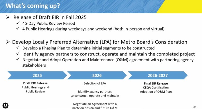 Metro anticipates the project’s draft Environmental Impact Report (EIR) will be released this fall. That will be followed by the Metro board selecting the final project design (the Locally Preferred Alternative – LPA) soon thereafter.