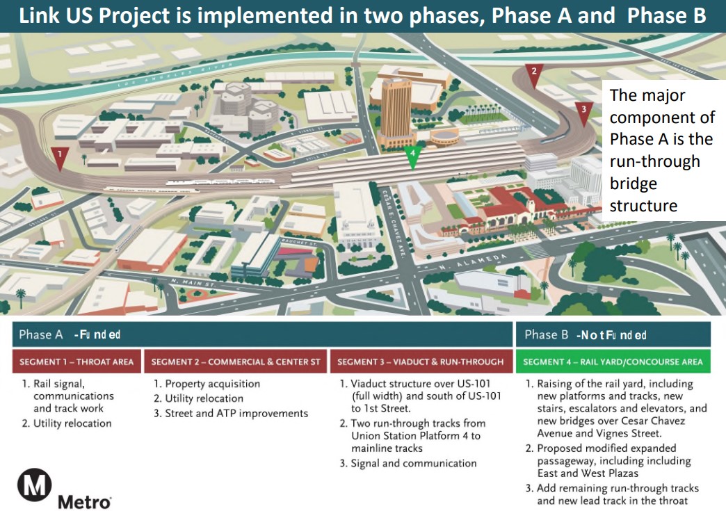 The mega-project includes building new bridge structures over and along the 101 Freeway and extensively retooling of the historic station – all while keeping trains running. Early estimates anticipated Link US would cost around $3 billion; now just the initial phase (mainly extending tracks over the 101) could cost that much.