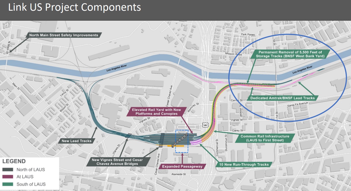 Metro’s Link US tracks over the 101 will connect to existing rail along the L.A. River. That connection requires removing 5,500 feet of storage tracks in the BNSF West Bank Yard, where BNSF assembles freight trains. Metro offered to buy these tracks, but BNSF refused.