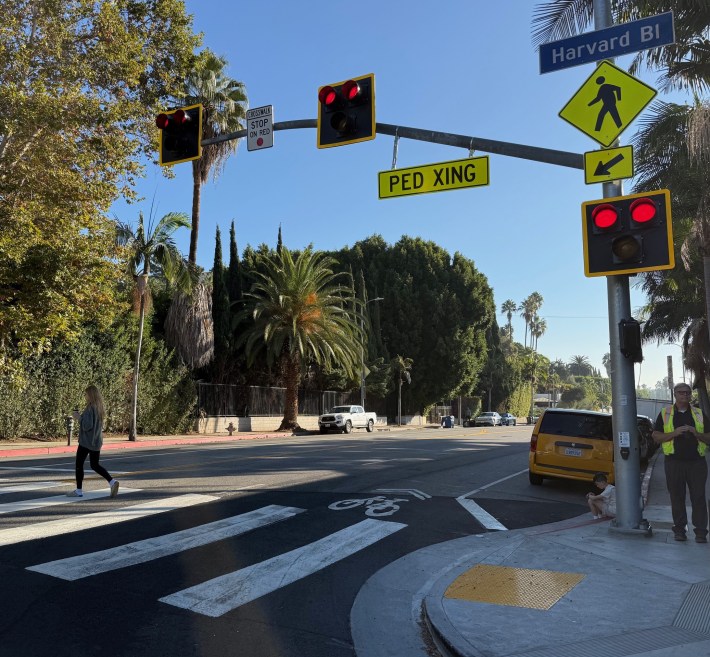 "This is the ultimate diva of crosswalks" proclaimed neighborhood resident Shamey Cramer, who advocated for the safety upgrades. The project includes a fancy signalized crosswalk, the kind where pedestrians push a button and lights flash to alert drivers. Prior to now, there had been no marked crosswalks across Franklin for about half a mile, between Western and Normandie Avenues.