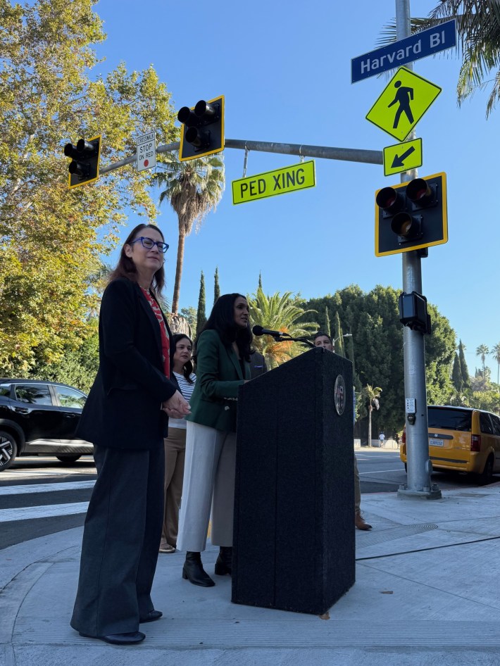 The improvements were shepherded by L.A. City Councilmember Nithya Raman, who spoke of the need to "reorient our system" so that prioritizing pedestrian safety is "an everyday occurrence... not something so unusual that it deserves a ribbon-cutting."