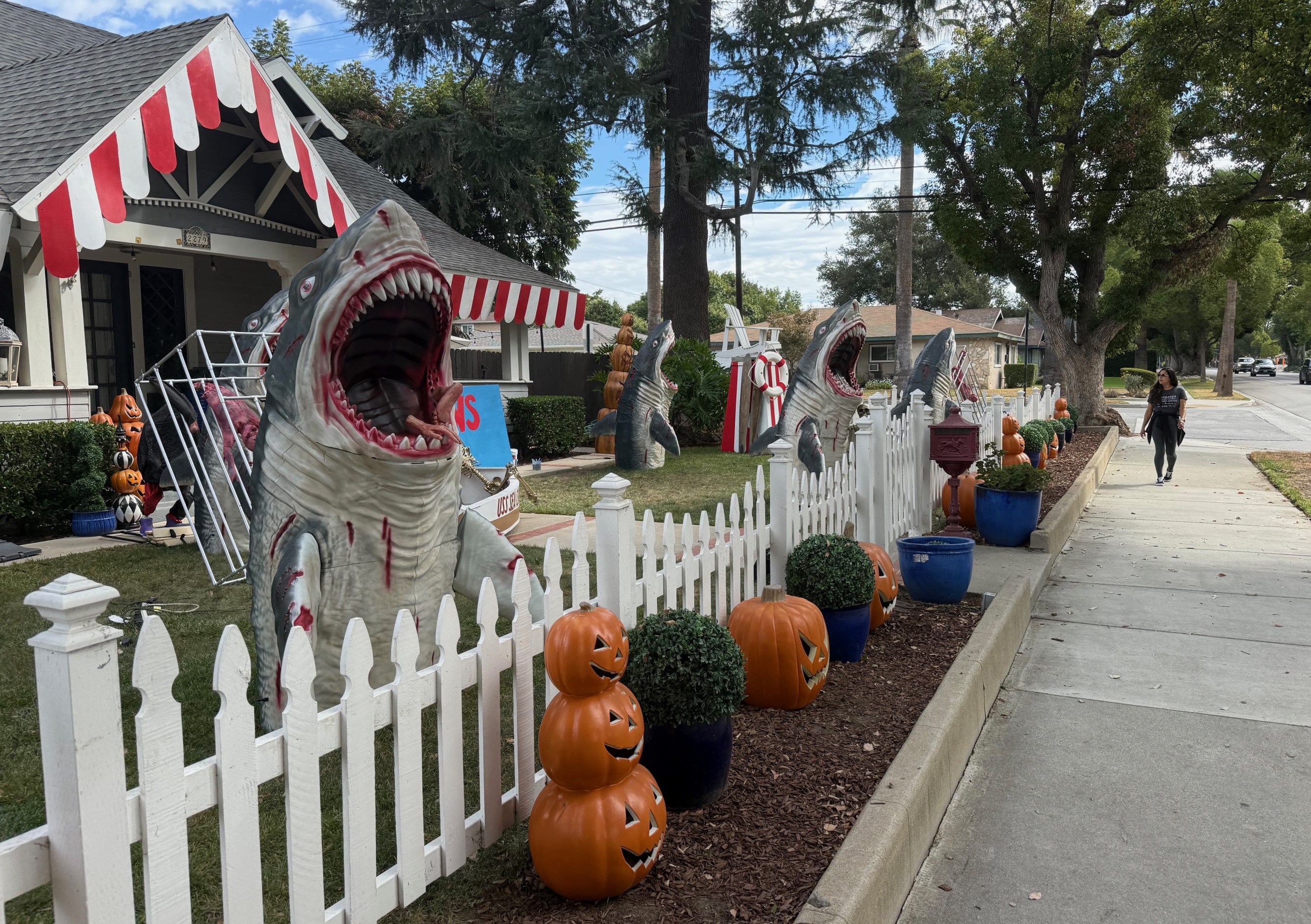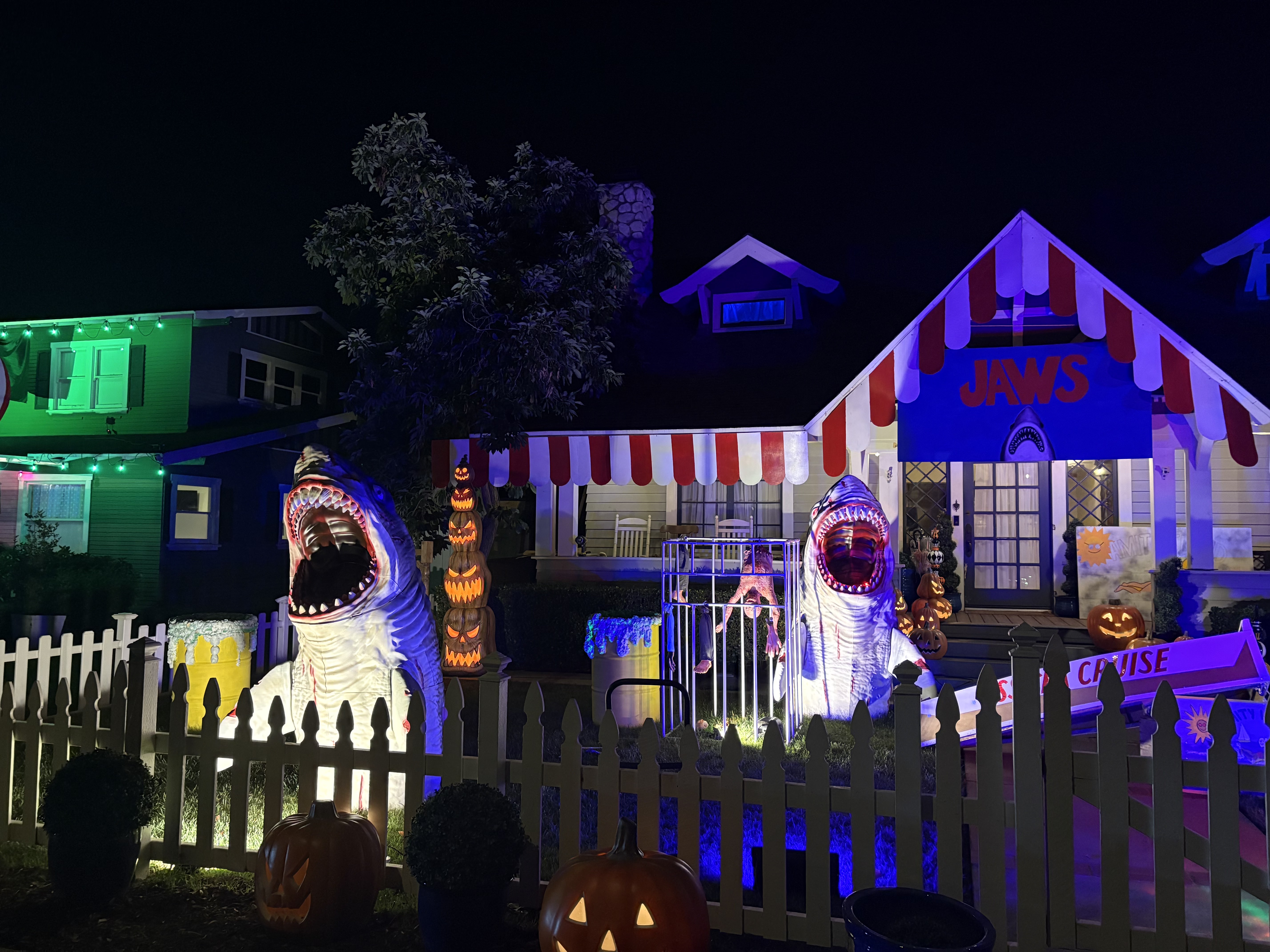 This is the pièce de résistance—the Jaws-themed house with five screaming sharks coming out of the grass.