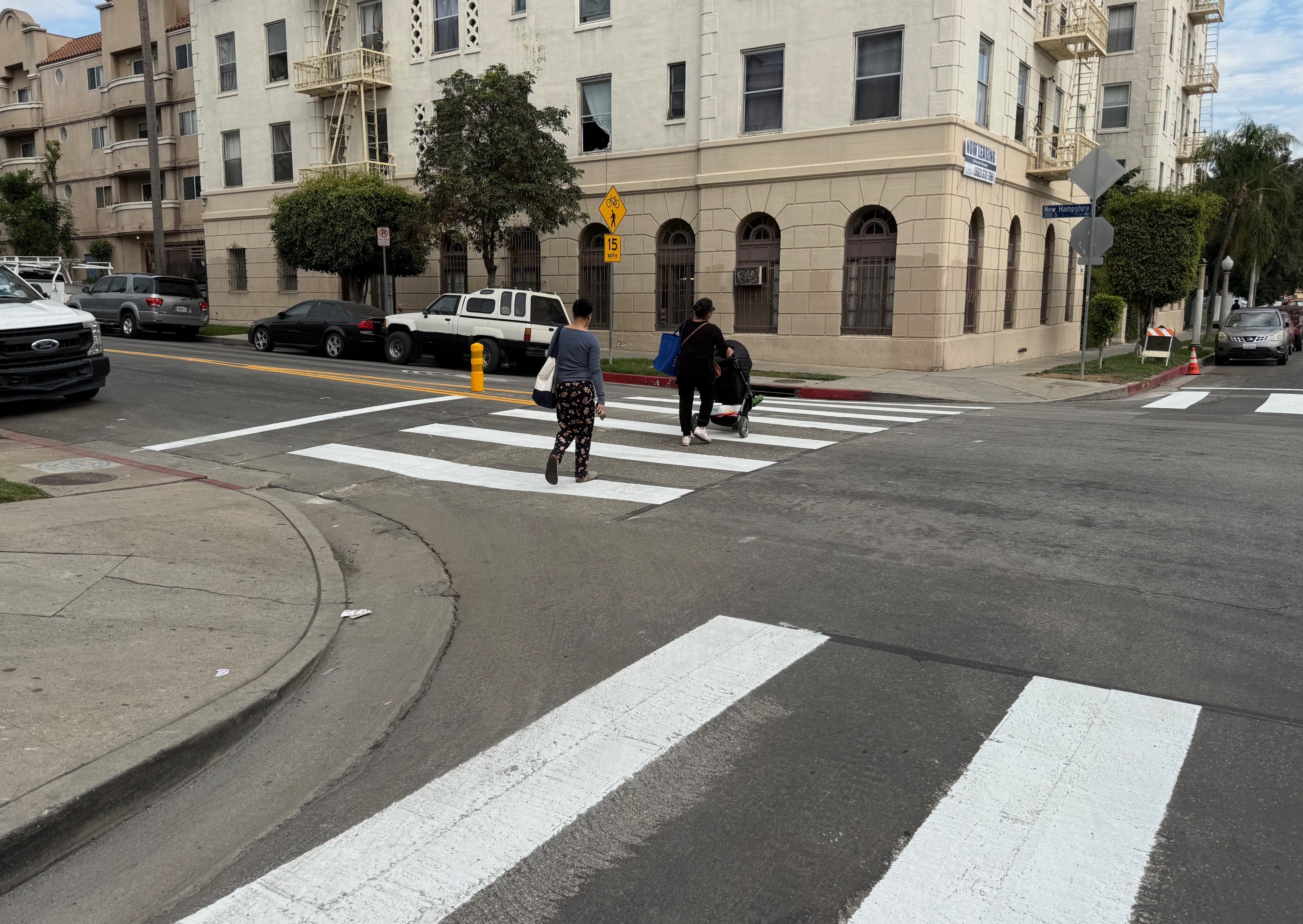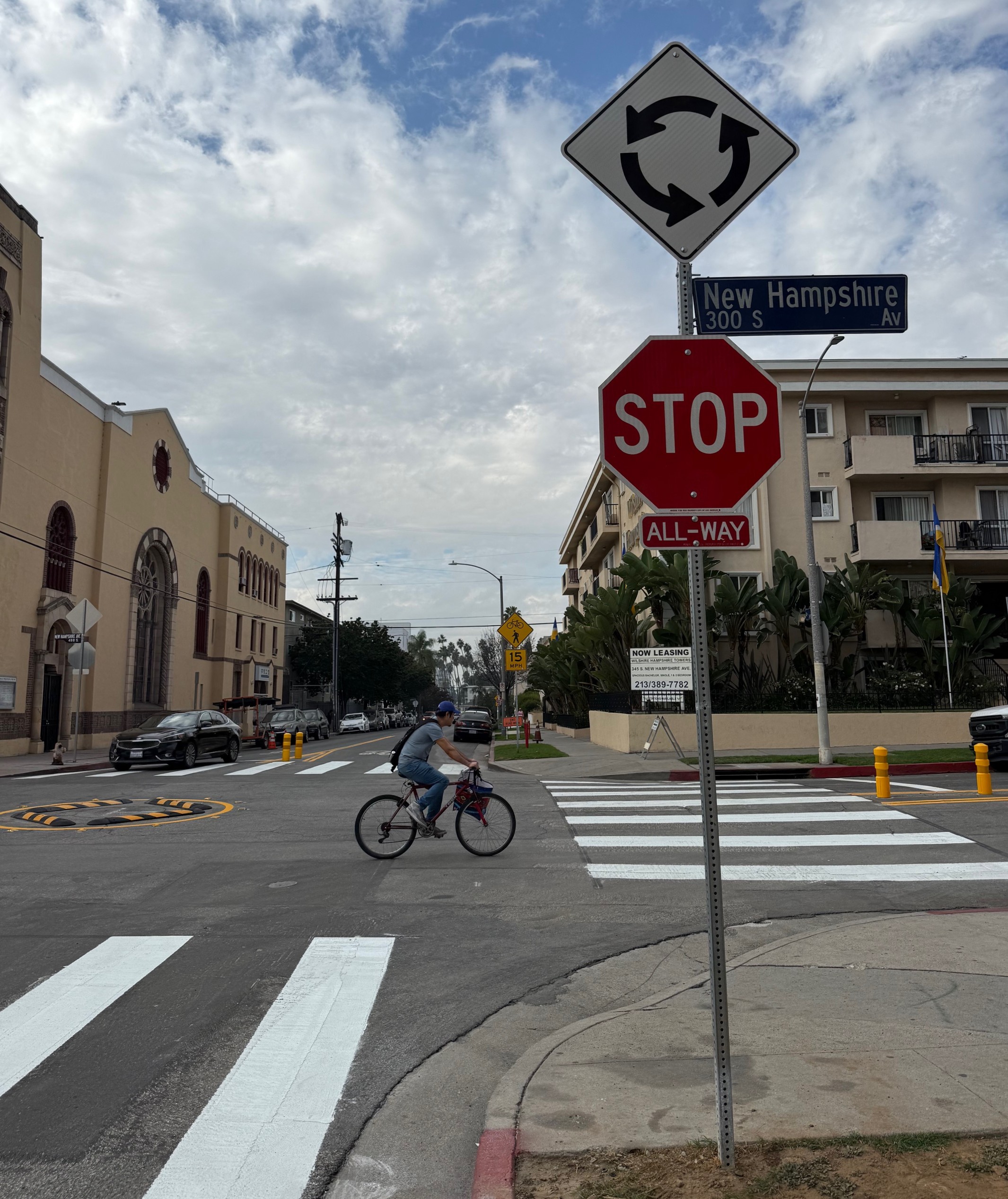 As announced earlier this week, the L.A. City Transportation Department (LADOT) completed a new quick-build traffic circle and official crosswalks at the Koreatown intersection of 4th Street and New Hampshire Avenue.