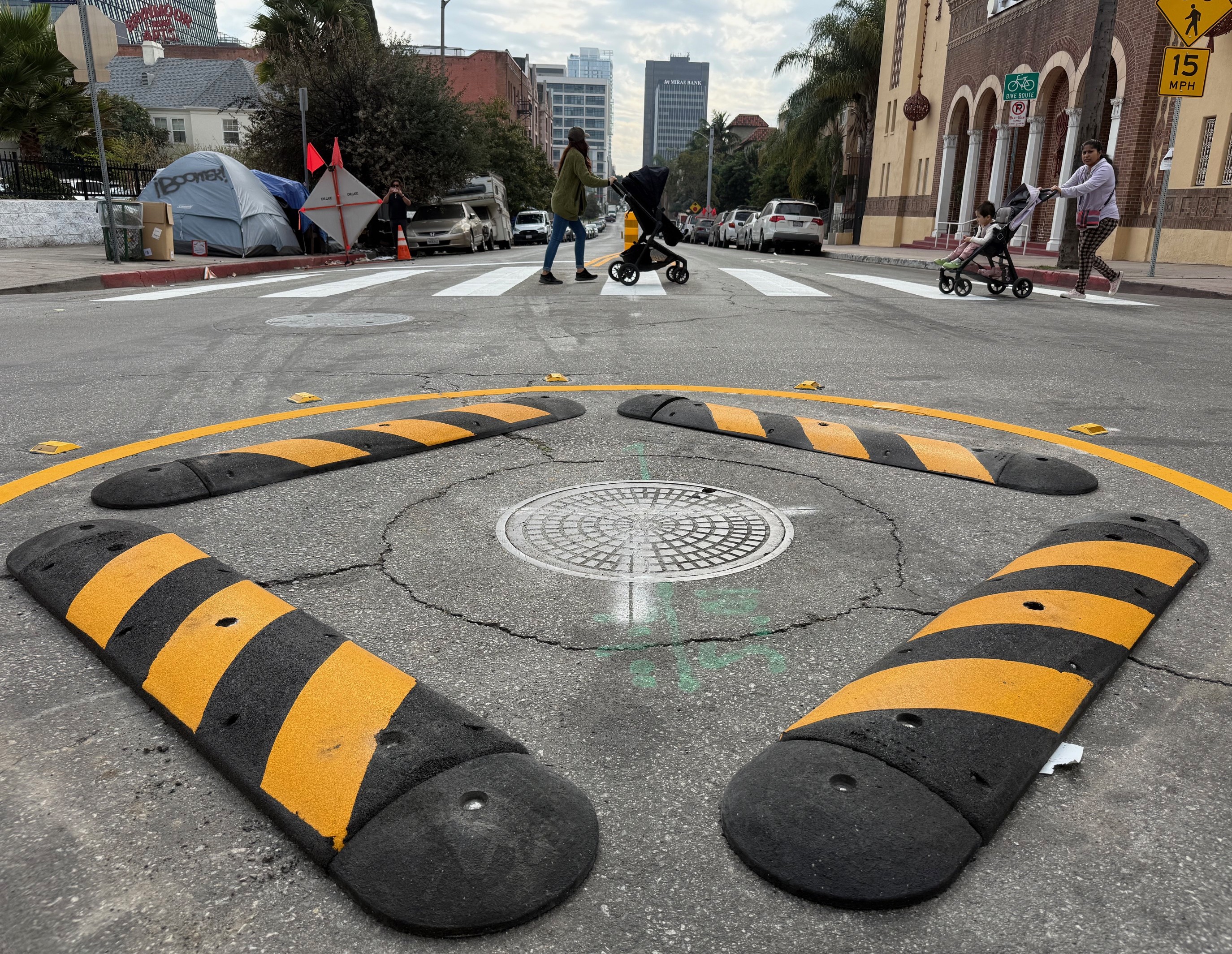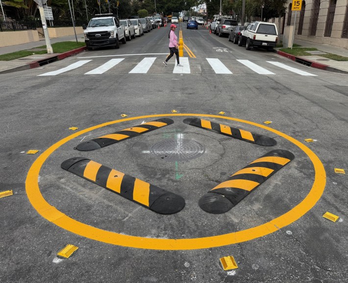 LADOT plans to install a permanent concrete traffic circle there. The project was funded in 2011, and after several delays, LADOT now expects construction to get underway in 2026.