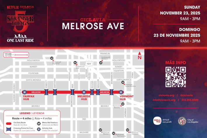 - Sunday 11/23 - CicLAvia returns to Melrose Avenue with a Stranger Things themed event; the official full title is Netflix x CicLAvia - Melrose Ave: Stranger Things 5 One Last Ride! This open streets event is fun, family-friendly, and free. From 9 a.m. to 3 p.m. on temporarily car-free streets, bike/walk/skate/etc. as much or as little as you like. The route is very easily accessed via Metro rail. Take the Metro B Line subway to the Vermont/Santa Monica Boulevard Station, follow the signs toward the L.A. City College end of the station. Bike or walk east three blocks on Willow Brook Avenue, then turn leftt/south three blocks on Heliotrope Drive. Full event details