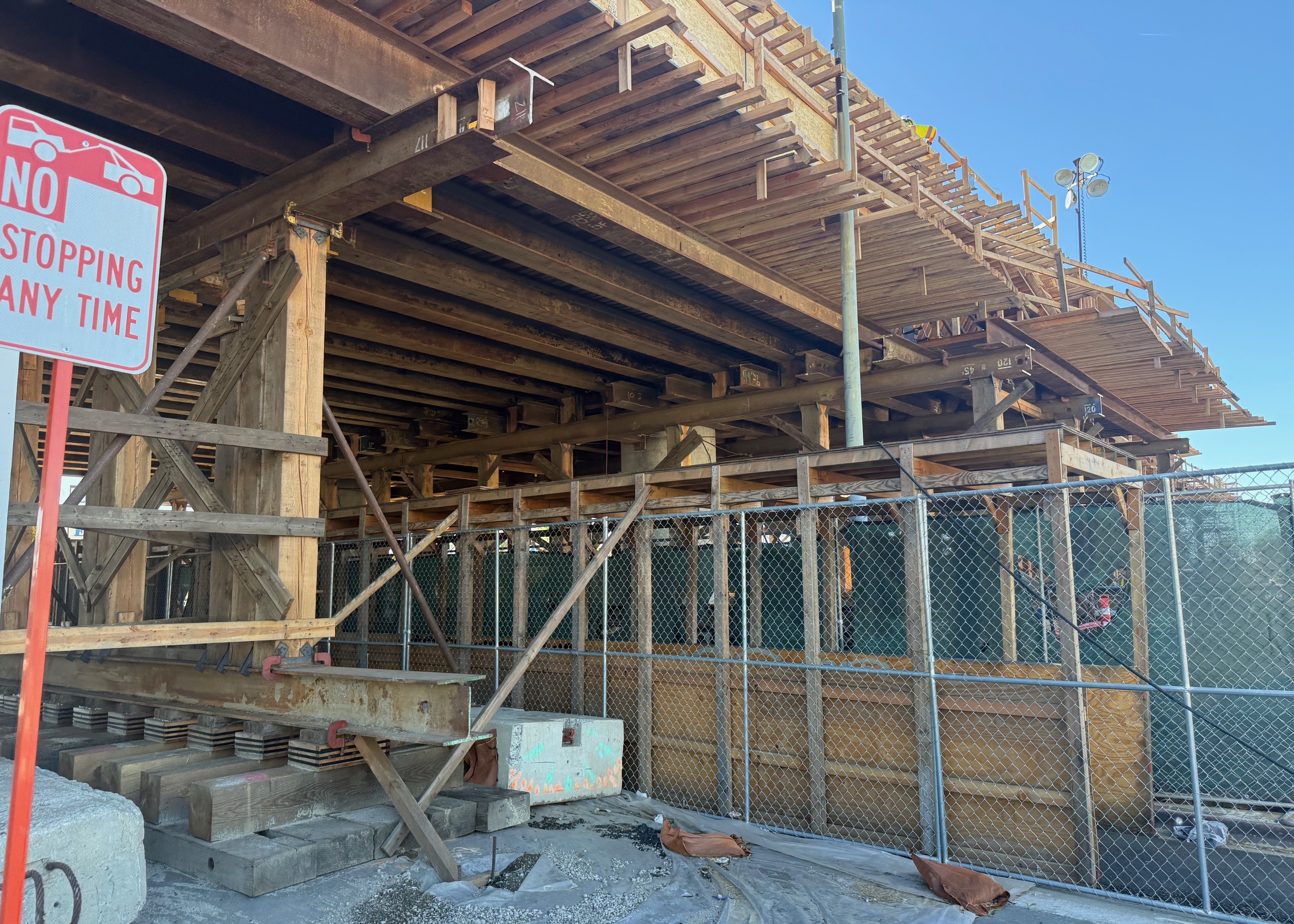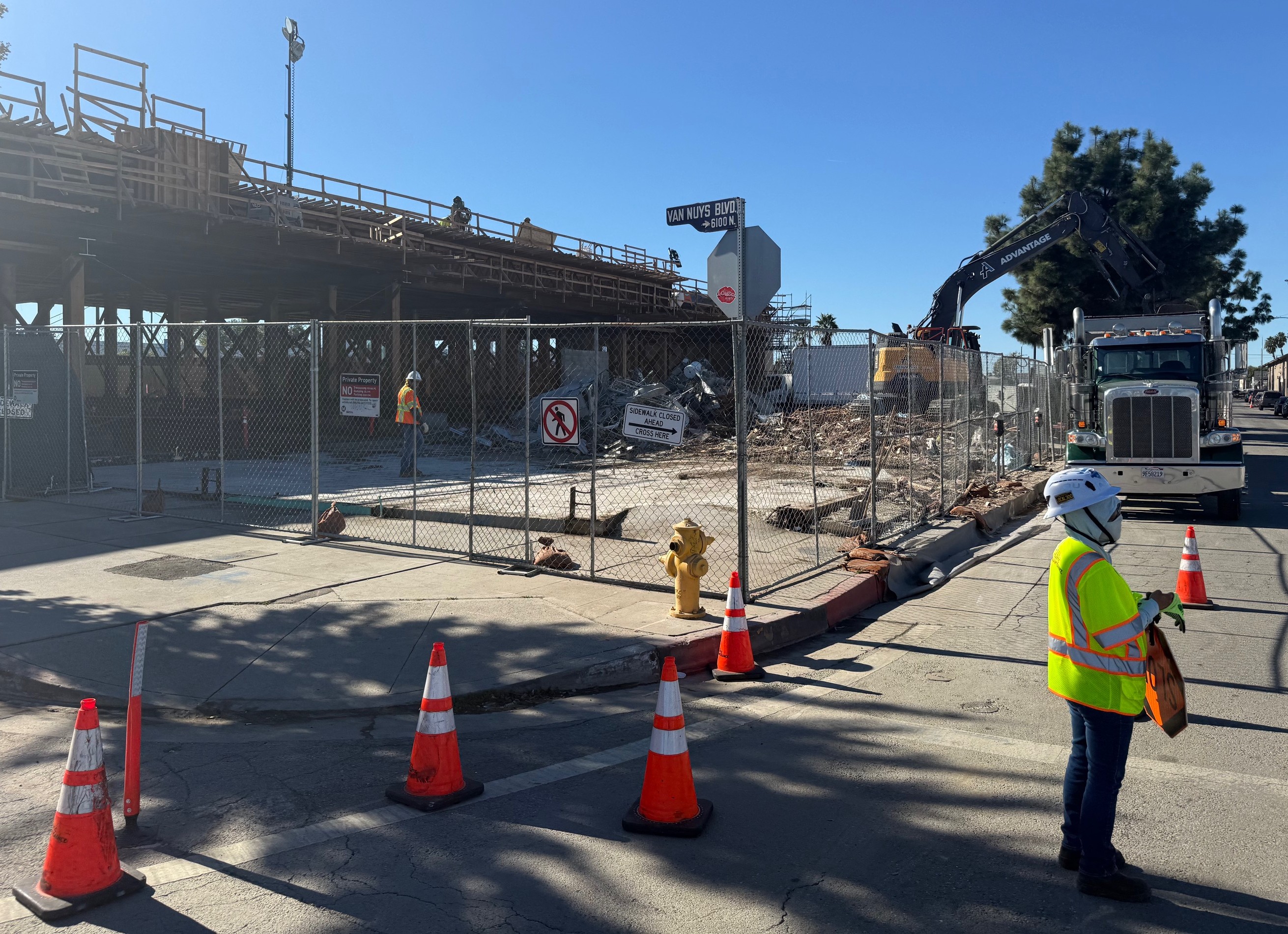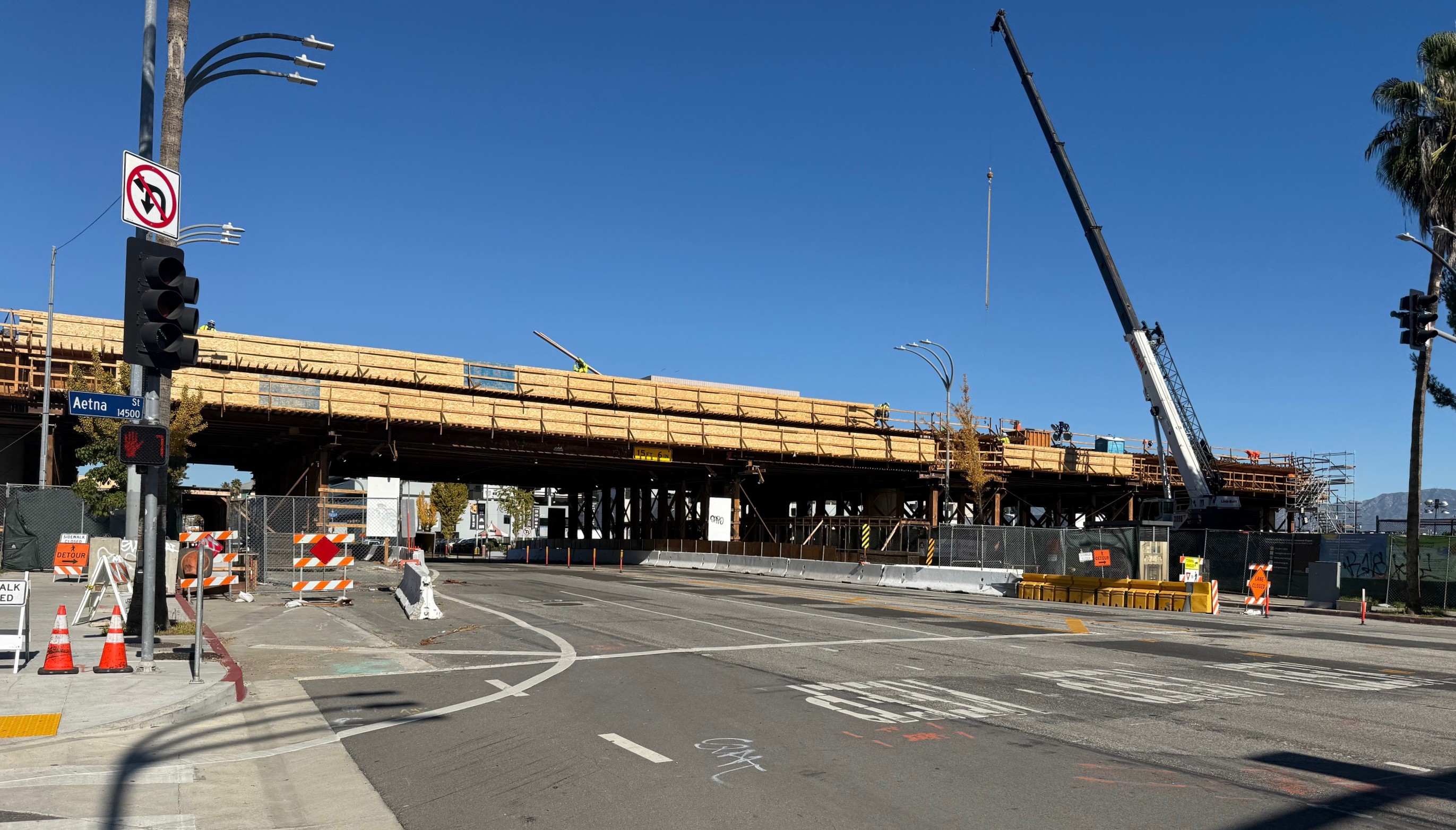 The under construction busway bridge now extends over Van Nuys Boulevard.
