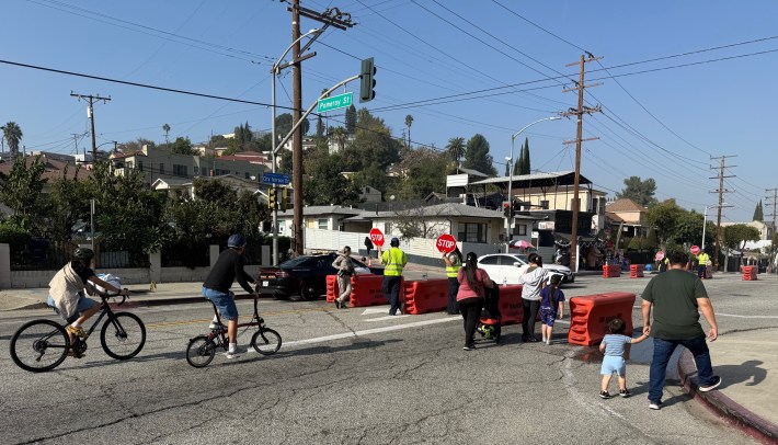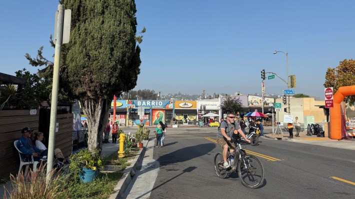 Streetsblog attended on Saturday. While there were a lot of people enjoying Camino City Terrace, attendance was less than a typical one-day CicLAvia event. Generally, open streets tend to get more participants with longer recurring routes, in central areas served by a Metro rail station. City Terrace is a fairly central neighborhood. The route was a little over a mile from the nearest Metro E Line Station. That ride, and the route itself, were somewhat hilly.
