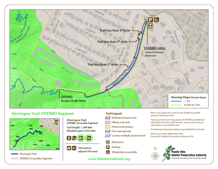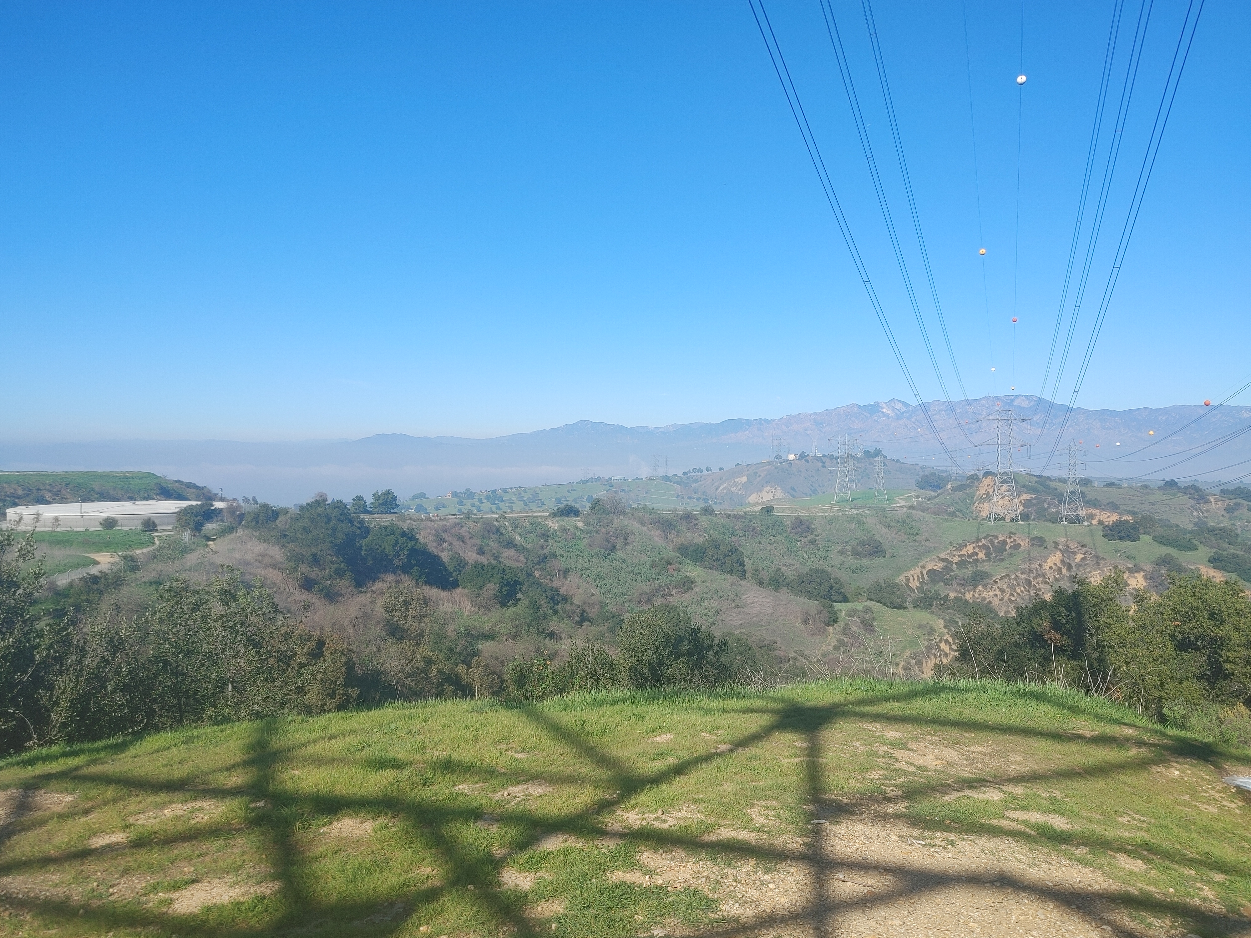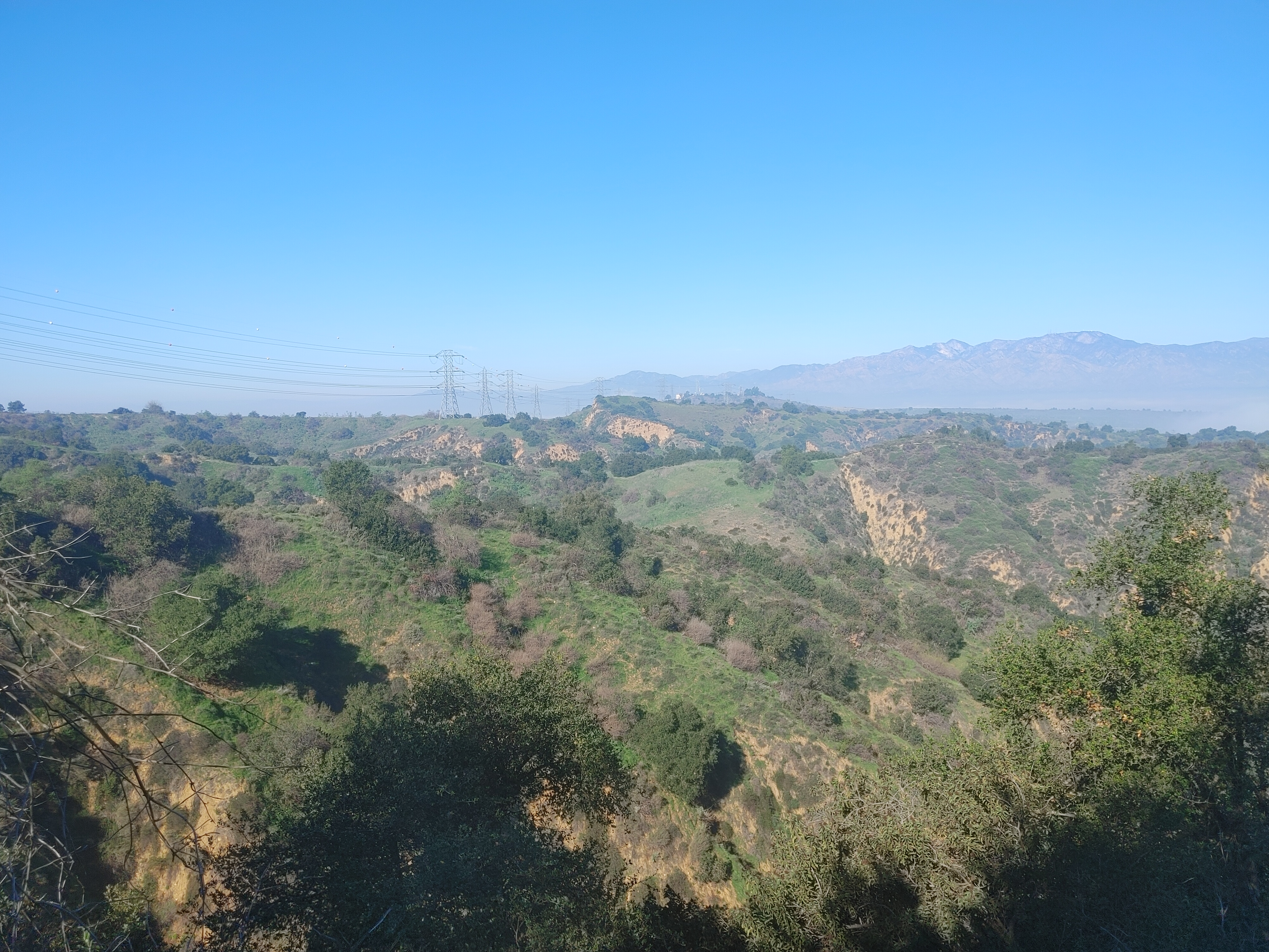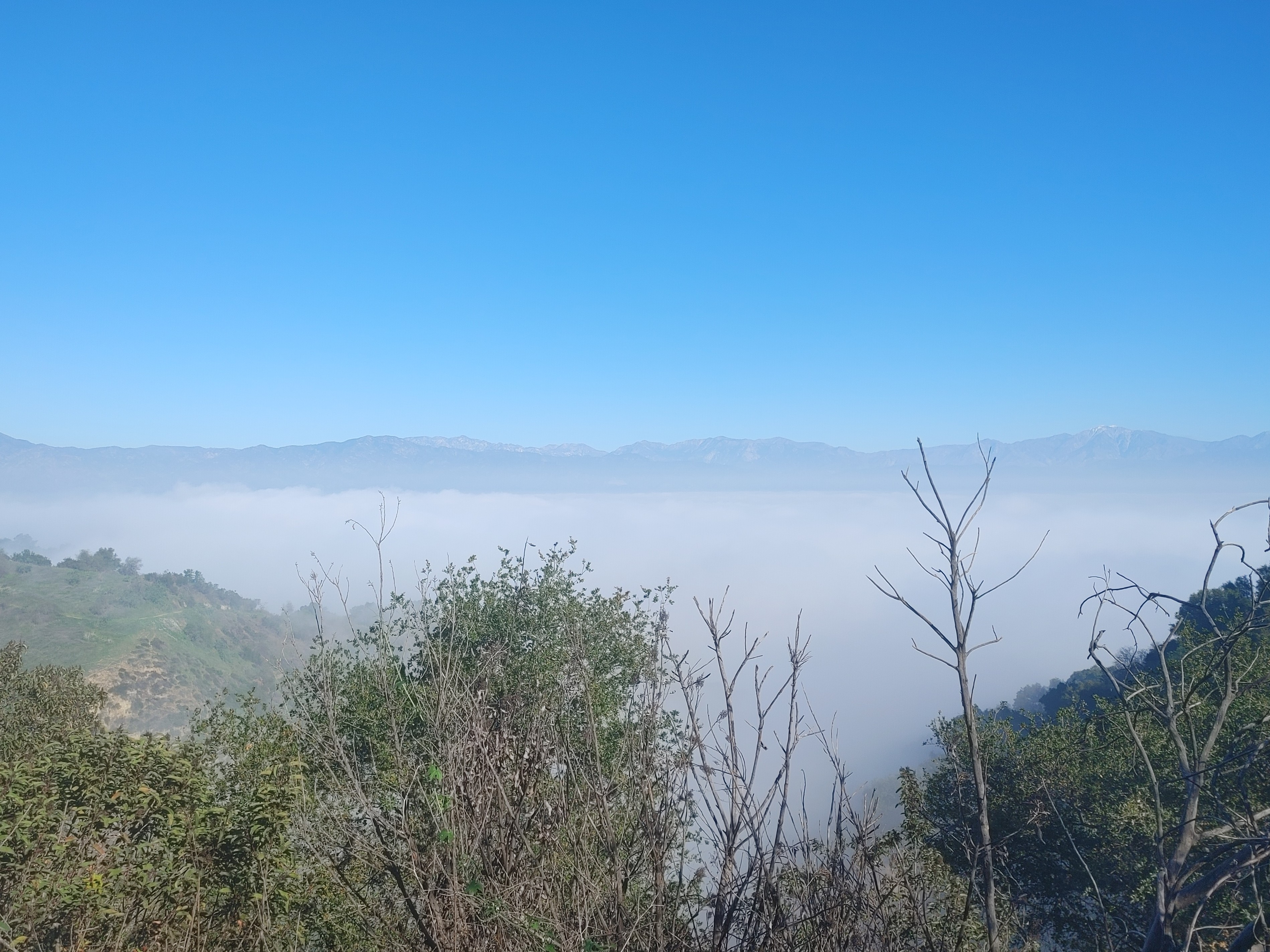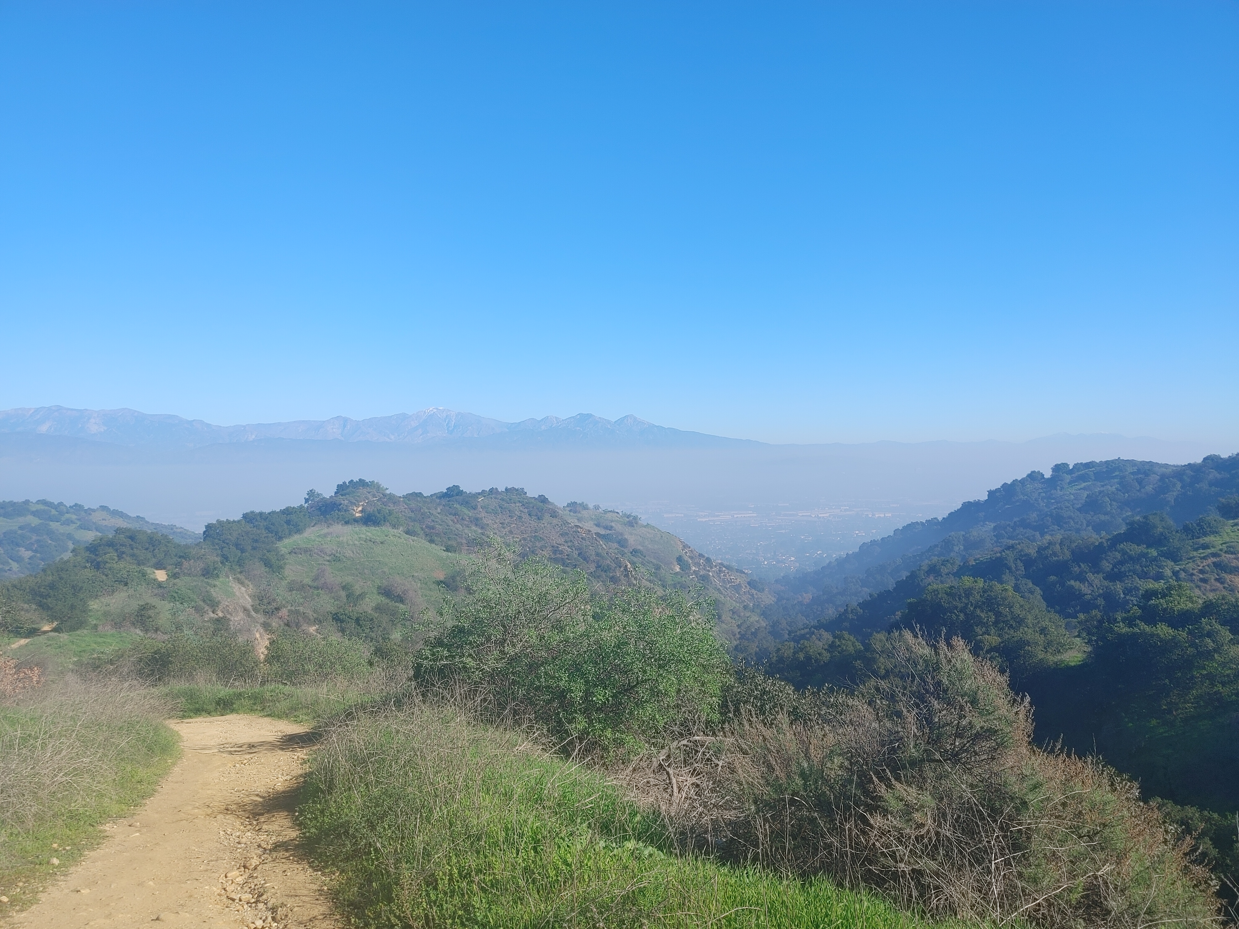The Ahwingna Trail is much less green and shady, but it’s open to dogs, horses, and cyclists. It’s steeper too, climbing 660 feet in 1.3 miles. But it also connects to more multimodal trails – the Native Oak Trail, and the Schabarum-Skyline Trail (near Turnbull Canyon and Rose Hills Cemetery). After the fog burnt off, there were great views all the way down.