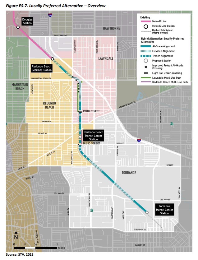 This K Line extension is a roughly $2-3 billion 4-mile light rail extension through the relatively suburban South Bay cities of Redondo Beach, Lawndale and Torrance. Many vocal Lawndale neighbors live next to the Metro-owned rail right-of-way (active freight rail, though only a few trains each week) and don’t want noisy Metro trains running through their area. They are pushing for a costlier Hawthorne Boulevard alternative that would likely make the project fiscally infeasible.
