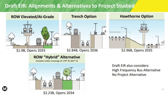 Hawthorne’s biggest issue is the cost. It’s more expensive to build elevated rail than it is to run mostly at-grade. The estimated price tag for Hawthorne elevated rail: ~$3 billion. That’s nearly 50 percent higher than ROW alternatives.