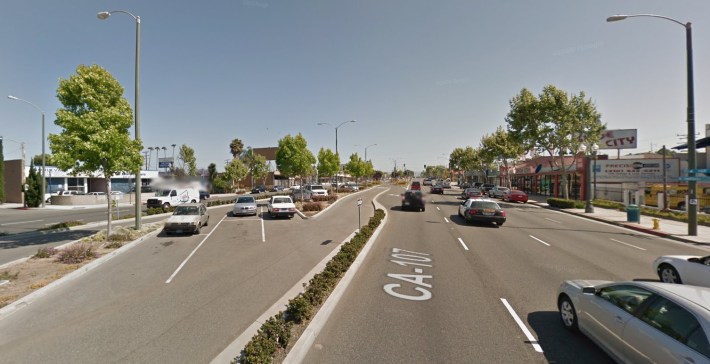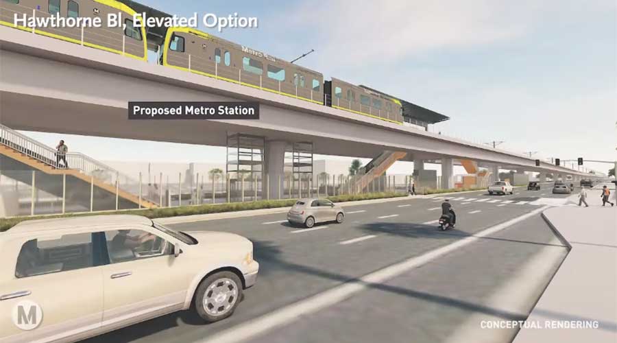 To get to Hawthorne Boulevard, elevated rail would to run in Caltrans 405 Freeway right-of-way. Caltrans typically strongly opposes these sorts of incursions into its freeway right-of-way (which it wants to preserve for freeway expansion).