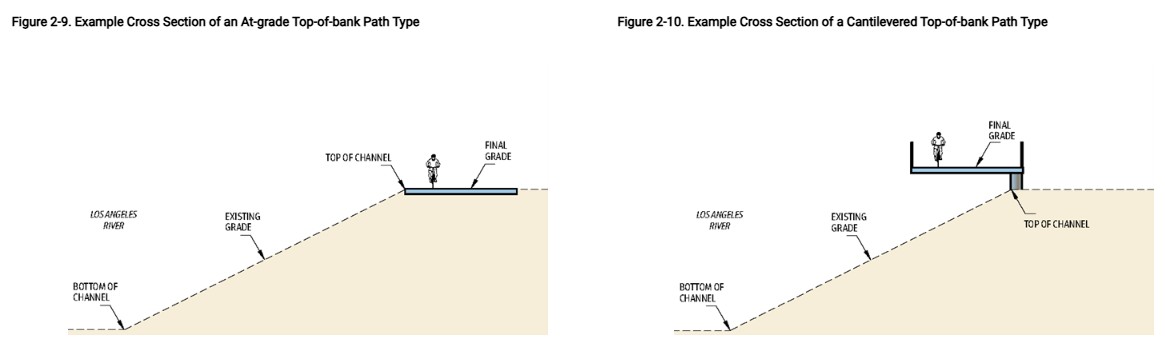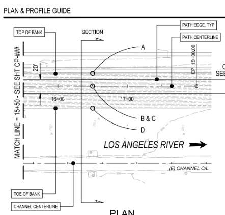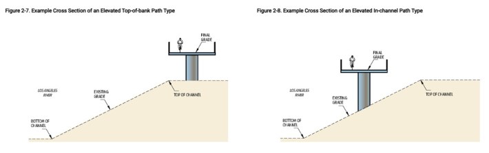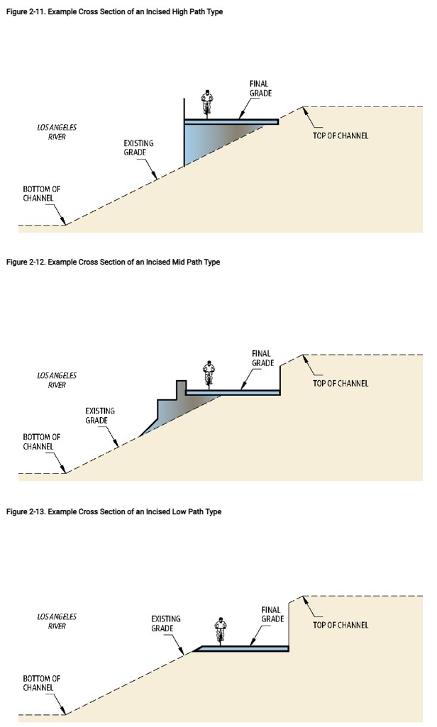 The impetus for this is good: it allows pedestrians and cyclists to have their own space so cyclists won’t crash into people on foot. But there’s no waterway bike/walk path in L.A. County that is anywhere near this wide. The existing river path segments are mostly 10-12 feet wide – sometimes narrowing to 8-feet in constrained areas. There are a lot of constrained areas in the downtown L.A. river stretch.