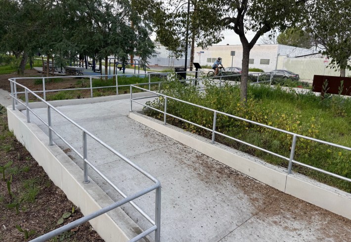 For the past few years, the city of L.A. - Councilmembers Paul Krekorian then Adrin Nazarian and the Bureau of Street Services - has been adding several official access points to the south. The undertaking is titled the Chandler Bicycle Path and Recreational Area Project; it adds concrete wheelchair-accessible ramps, used by folks on foot and on bike. New ramps are currently complete at Satsuma Avenue and Cartwright Avenue.