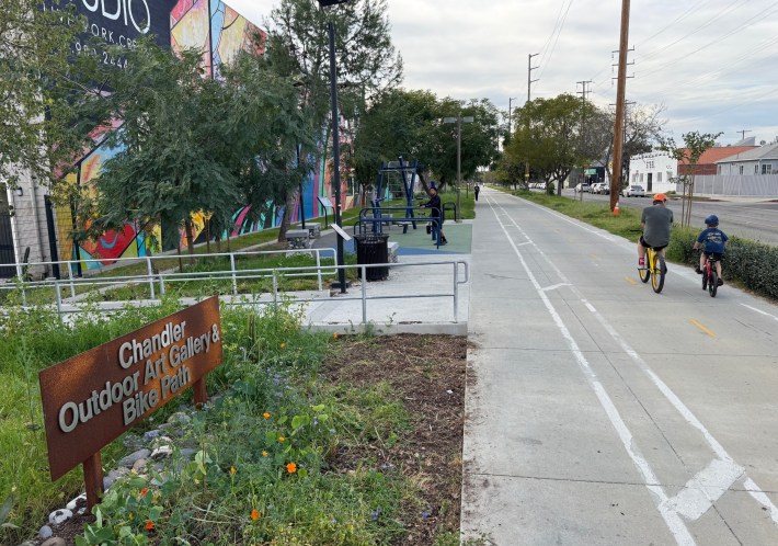 The Burbank-Chandler bike/walk path runs through two cities, Burbank and Los Angeles. The path is a very chill flat family-friendly ~2.5-mile rail-to-trail path, easy to access via the Metro B Line subway.