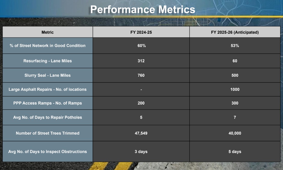With a similar budget and paving practices anticipated in FY26-27, overall pavement condition could continue to worsen.