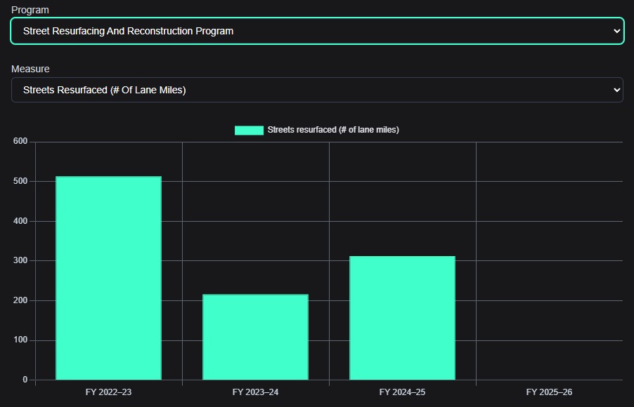 Last fiscal year (July 2024 to June 2025), StreetsLA resurfaced 312 lane-miles of L.A. Streets [per StreetsLA page 154]. This fiscal year, StreetsLA appears to be on track to resurface around 100-160 lane miles.