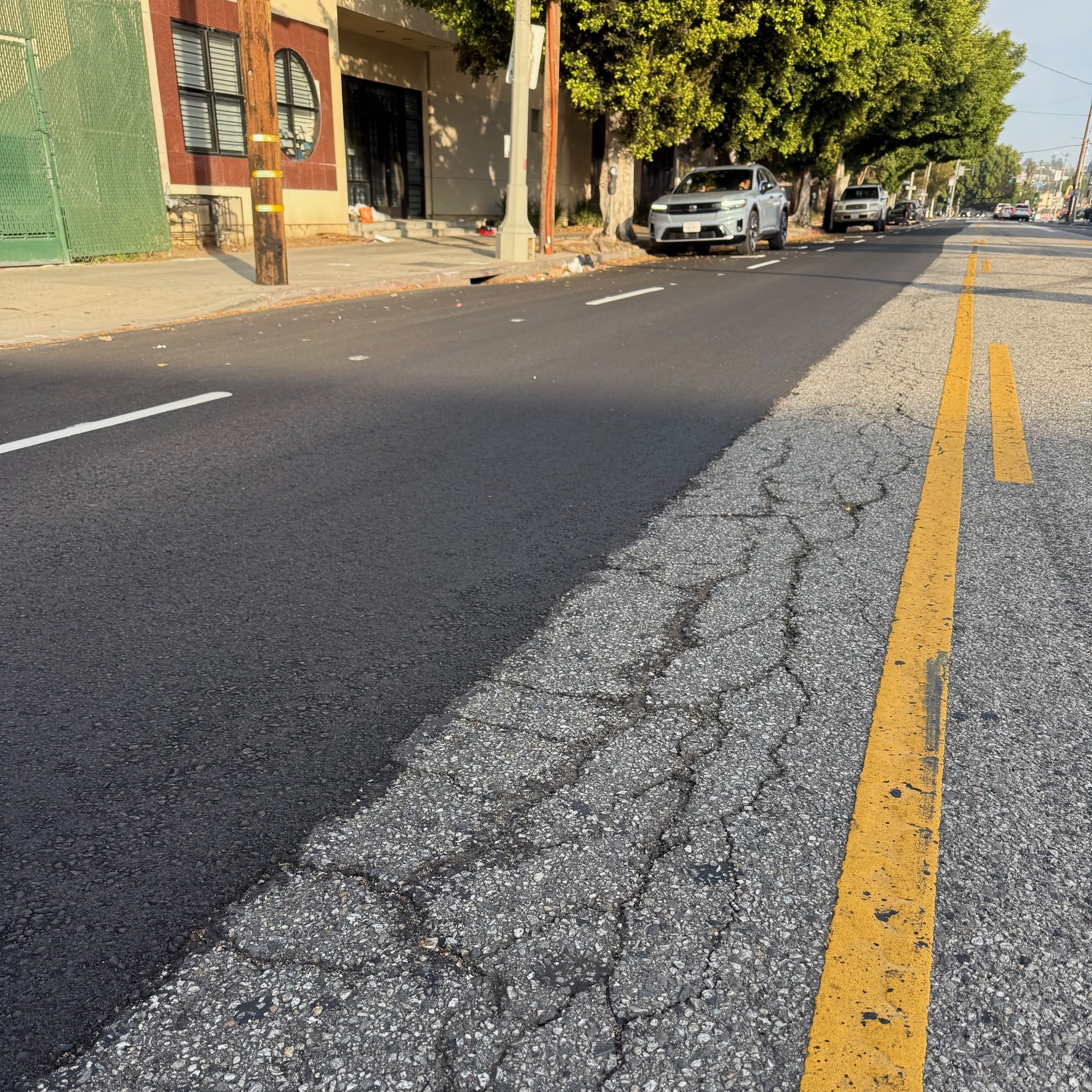 As explained above, since July 1, 2025, most StreetsLA repaving work is partial “LAR”, with new asphalt alongside cracked un-resurfaced sections.