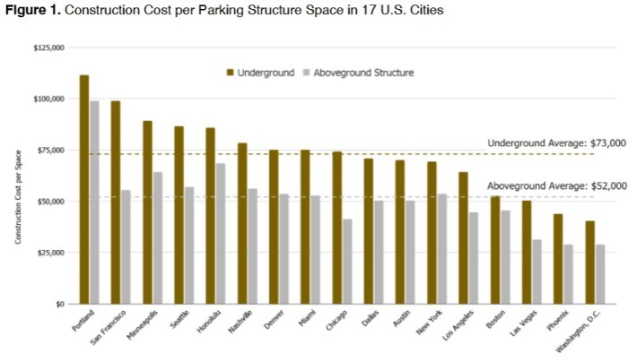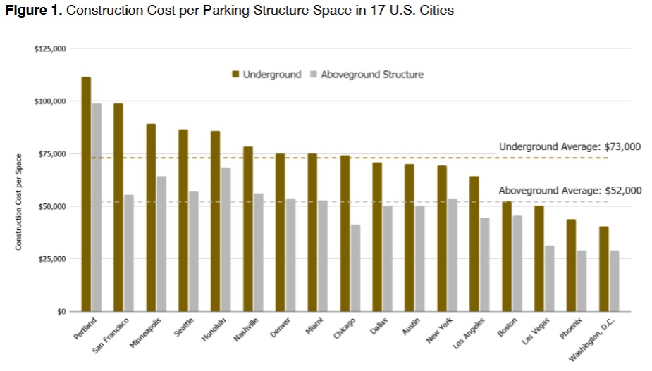 Not counting the cost of the land, an aboveground parking space costs on average $52,000 to build. Underground parking is even more expensive at $73,000 per space.