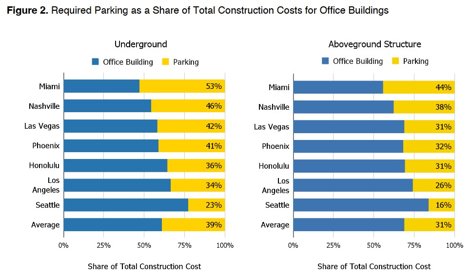 The report incorporates city parking requirements (for example, for an office building, L.A. City generally requires two parking spaces per 1,000 square feet of building floor space) to track the percentage of overall construction costs attributable to building required parking. For Los Angeles, the cost to construct city-required parking accounts for a quarter to a third of the overall cost of building a new office space.