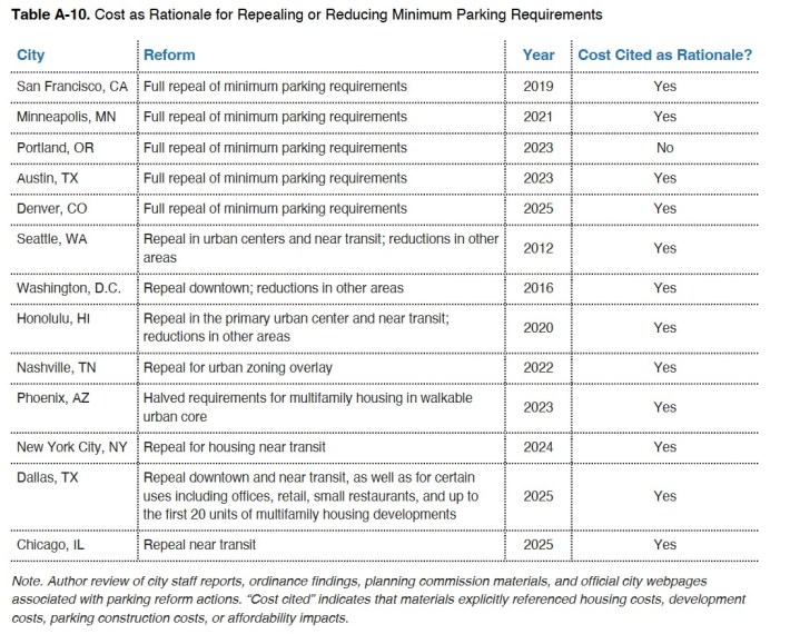 Then there is somewhat good news. In large part due to parking costing so much, many cities are reforming their outdated pseudoscientific parking requirements. For the 17 cities in the report, the majority have already either fully or partially removed minimum parking requirements. Even L.A. is studying eliminating its one-size-fits-all citywide parking requirements, instead allowing new development to determine project-specific parking needs.