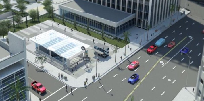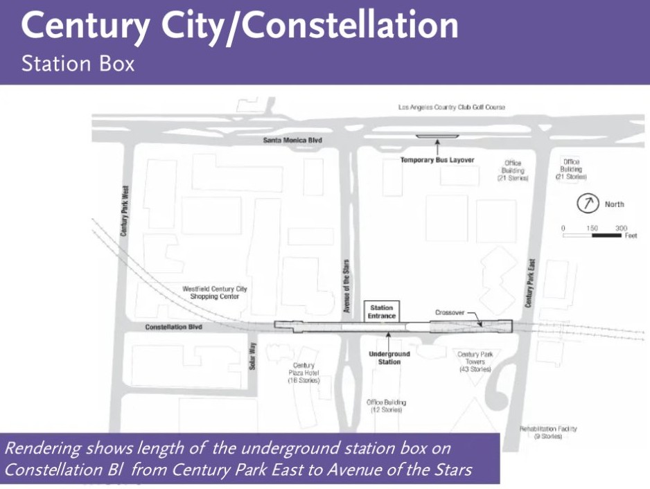 The Century City Station is located at the north corner of the intersection of Constellation Boulevard and Avenue of the Stars.