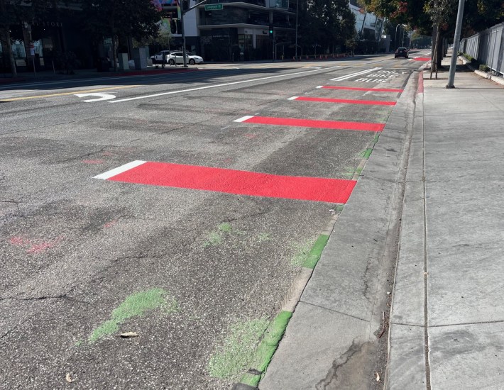 When LADOT reconfigures lane markings (sometimes for road diet improvements), the project typically involves scraping off existing stripes. The former stripes are often visible, not as a painted line, but as a sort of visible linear scrape mark. I like to think of these as "road diet ghost stripes" though there may be some more official name for this.