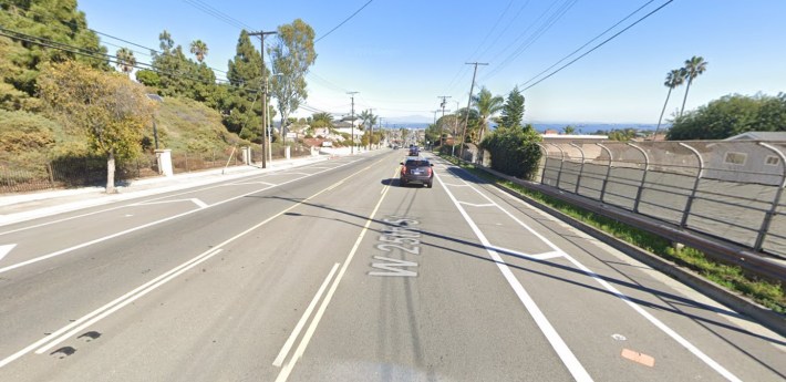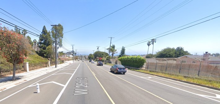 In 2018, LADOT upgraded a mile of San Pedro's 25th Street bike lanes from Patton Street to Western Avenue (a no-parking stretch many drivers speed). The project added a buffer, lined with plastic bollards.
